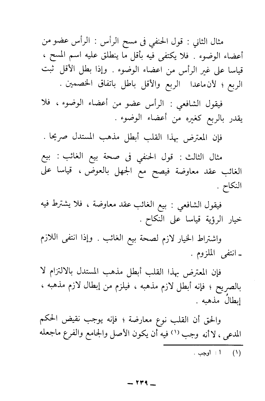 مِثَالُ الثَّانِي: قَوْلُ الْحَنَفِيِّ فِي مَسْحِ الرَّأْسِ: الرَّأْسُ عُضْوٌ مِنْ أَعْضَاءِ الْوُضُوءِ، فَلَا يُكْتَفَى فِيهِ بِأَقَلِّ مَا يَنْطَلِقُ عَلَيْهِ اسْمُ الْمَسْحِ، قِيَاسًا عَلَى غَيْرِ الرَّأْسِ مِنْ أَعْضَاءِ الْوُضُوءِ. وَإِذَا بَطَلَ الْأَقَلُّ ثَبَتَ الرُّبُعُ ; لِأَنَّ مَا عَدَا الرُّبُعَ وَالْأَقَلَّ بَاطِلٌ بِاتِّفَاقِ الْخَصْمَيْنِ.
