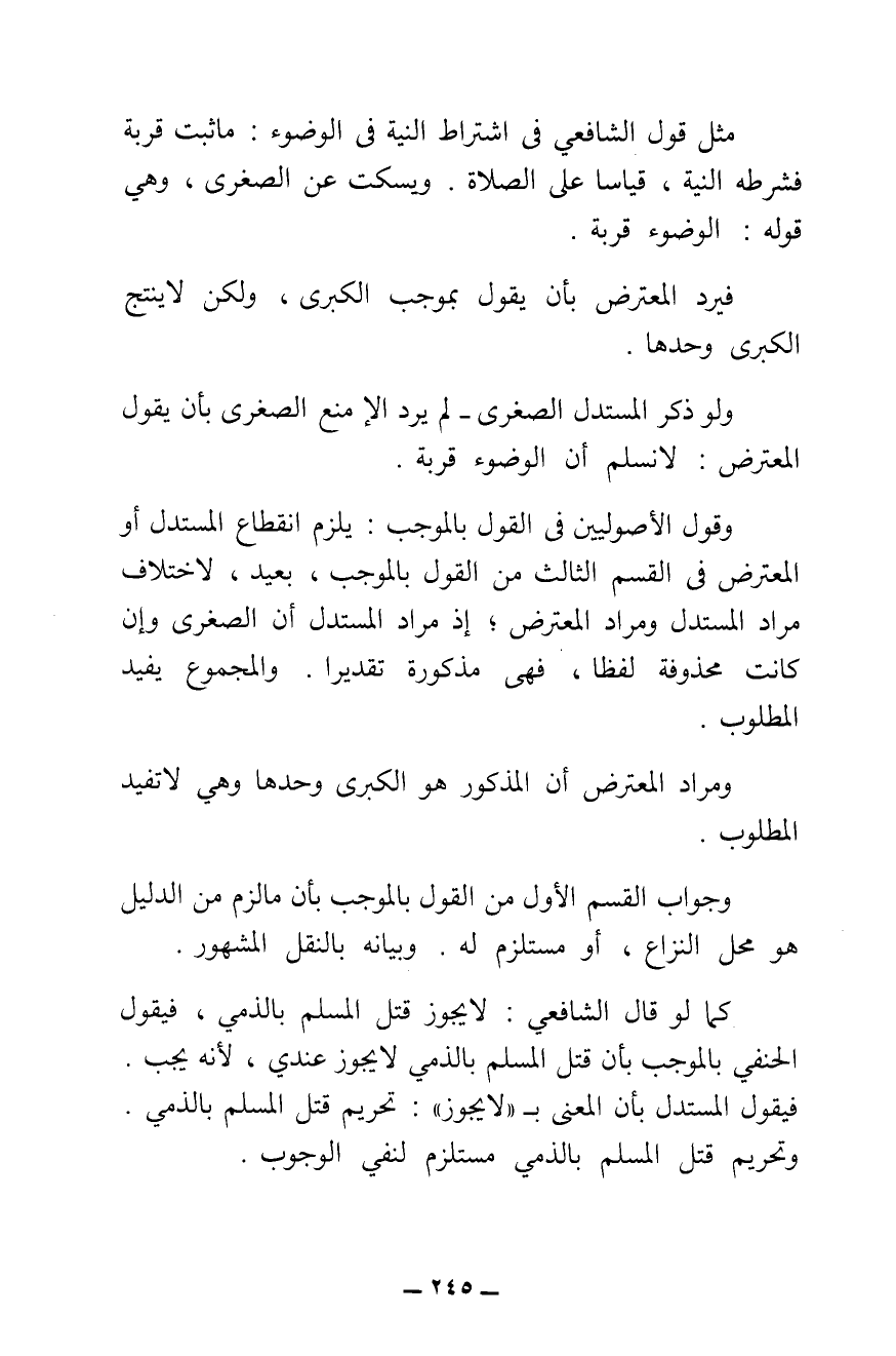 وَجَوَابُ الْقِسْمِ الْأَوَّلِ مِنَ الْقَوْلِ بِالْمُوجَبِ بِأَنْ مَا لَزِمَ مِنَ الدَّلِيلِ هُوَ مَحَلُّ النِّزَاعِ، أَوْ مُسْتَلْزِمٌ لَهُ، وَبَيَانُهُ بِالنَّقْلِ الْمَشْهُورِ، كَمَا لَوْ قَالَ الشَّافِعِيُّ: لَا يَجُوزُ قَتْلُ الْمُسْلِمِ بِالذِّمِّيِّ، فَيَقُولُ الْحَنَفِيُّ بِالْمُوجَبِ بِأَنَّ قَتْلَ الْمُسْلِمِ بِالذِّمِّيِّ لَا يَجُوزُ عِنْدِي ; لِأَنَّهُ يَجِبُ. فَيَقُولُ الْمُسْتَدِلُّ بِأَنَّ الْمَعْنَى بِـ (لَا يَجُوزُ) : تَحْرِيمُ قَتْلِ الْمُسْلِمِ بِالذِّمِّيِّ، وَتَحْرِيمُ قَتْلِ الْمُسْلِمِ بِالذِّمِّيِّ مُسْتَلْزِمٌ لِنَفْيِ الْوُجُوبِ.