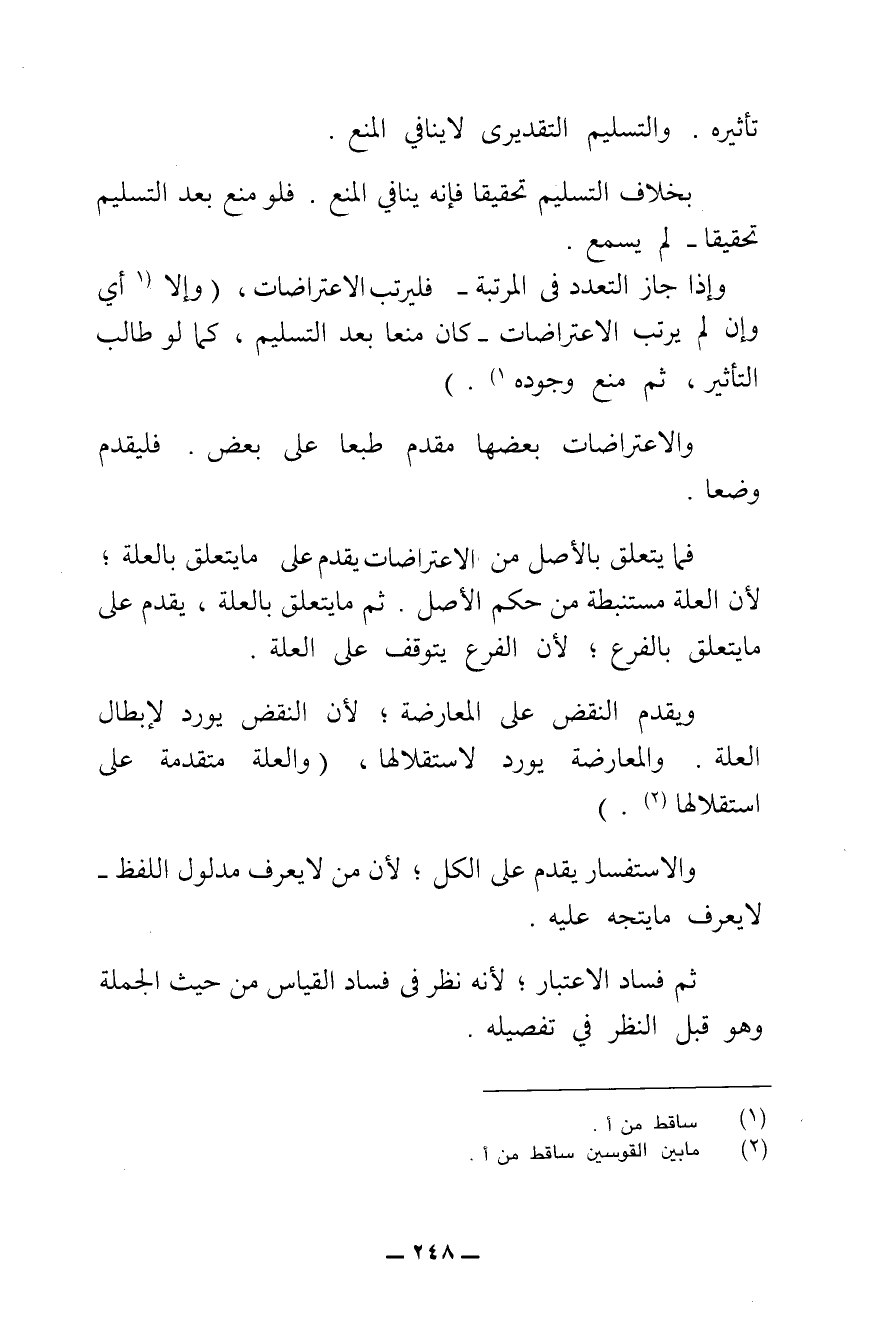 وَالِاعْتِرَاضَاتُ بَعْضُهَا مُقَدَّمٌ طَبْعًا عَلَى بَعْضٍ، فَلْيُقَدَّمْ وَضْعًا. فَمَا يَتَعَلَّقُ بِالْأَصْلِ مِنَ الِاعْتِرَاضَاتِ يُقَدَّمُ عَلَى مَا يَتَعَلَّقُ بِالْعِلَّةِ ; لِأَنَّ الْعِلَّةَ مُسْتَنْبَطَةٌ مِنْ حُكْمِ الْأَصْلِ، ثُمَّ مَا يَتَعَلَّقُ بِالْعِلَّةِ يُقَدَّمُ عَلَى مَا يَتَعَلَّقُ بِالْفَرْعِ ; لِأَنَّ الْفَرْعَ يَتَوَقَّفُ عَلَى الْعِلَّةِ.