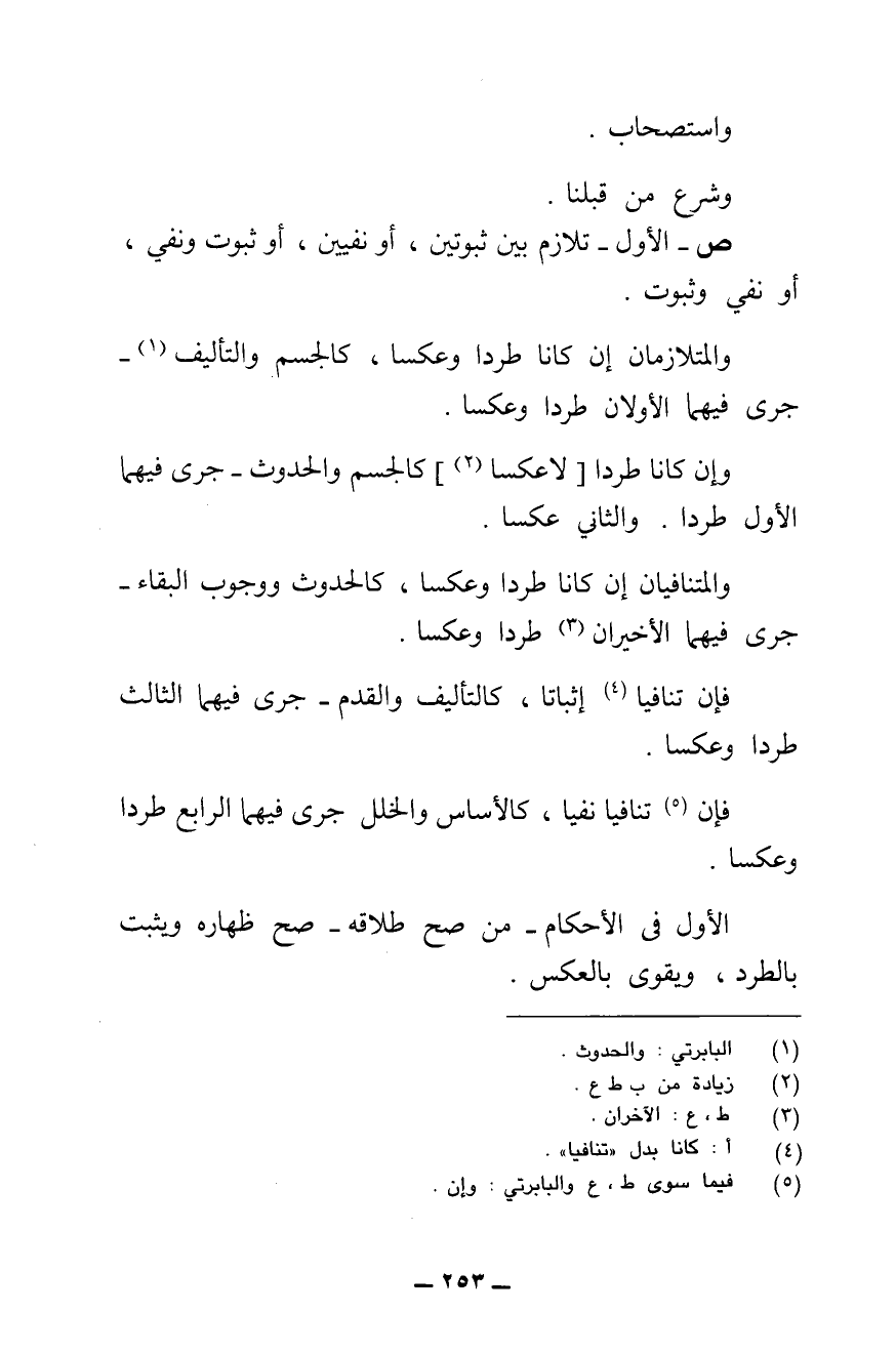 ش - الْأَوَّلُ مِنْ أَقْسَامِ الِاسْتِدْلَالِ، وَهُوَ عَلَى أَرْبَعَةِ أَقْسَامٍ ; لِأَنَّ الْمُتَلَازِمَيْنِ إِمَّا أَنْ يَكُونَا ثُبُوتَيْنِ أَوْ نَفْيَيْنِ، أَوِ الْأَوَّلُ ثُبُوتٌ وَالْآخَرُ نَفْيٌ، أَوِ الْأَوَّلُ نَفْيٌ وَالْآخَرُ ثُبُوتٌ.