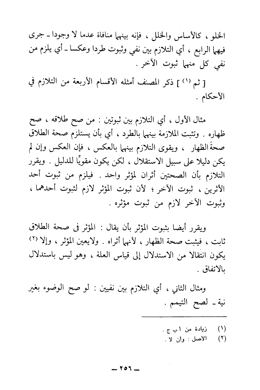 مِثَالُ الْأَوَّلِ: أَيِ التَّلَازُمُ بَيْنَ ثُبُوتَيْنِ: مَنْ صَحَّ طَلَاقُهُ، صَحَّ ظِهَارُهُ. وَتَثْبُتُ الْمُلَازَمَةُ بَيْنَهُمَا بِالطَّرْدِ، أَيْ بِأَنْ يَسْتَلْزِمَ صِحَّةُ الطَّلَاقِ صِحَّةَ الظِّهَارِ، وَيَقْوَى التَّلَازُمُ بَيْنَهُمَا بِالْعَكْسِ، فَإِنَّ الْعَكْسَ وَإِنْ لَمْ يَكُنْ دَلِيلًا عَلَى سَبِيلِ الِاسْتِقْلَالِ، لَكِنْ يَكُونُ مُقَوِّيًا لِلدَّلِيلِ، وَيُقَرَّرُ التَّلَازُمُ بِأَنَّ الصِّحَّتَيْنِ أَثَرَانِ لِمُؤَثِّرٍ وَاحِدٍ، فَيَلْزَمُ مِنْ ثُبُوتِ أَحَدِ الْأَثَرَيْنِ ثُبُوتُ الْآخَرِ ; لِأَنَّ ثُبُوتَ الْمُؤَثِّرِ لَازِمٌ لِثُبُوتِ أَحَدِهِمَا، وَثُبُوتَ الْآخَرِ لَازِمٌ مِنْ ثُبُوتِ مُؤَثِّرِهِ.