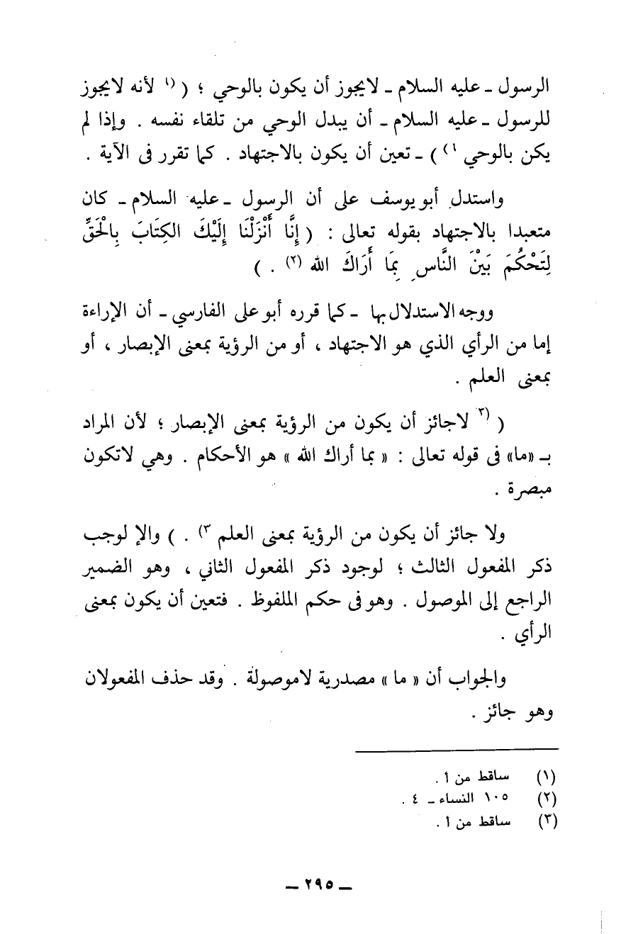 لَا جَائِزَ أَنْ يَكُونَ مِنَ الرُّؤْيَةِ بِمَعْنَى الْإِبْصَارِ ; لِأَنَّ الْمُرَادَ بِـ " مَا " فِي قَوْلِهِ - تَعَالَى: " {بِمَا أَرَاكَ اللَّهُ} [النساء: ١٠٥] " هُوَ الْأَحْكَامُ، وَهِيَ لَا تَكُونُ مُبْصَرَةً.