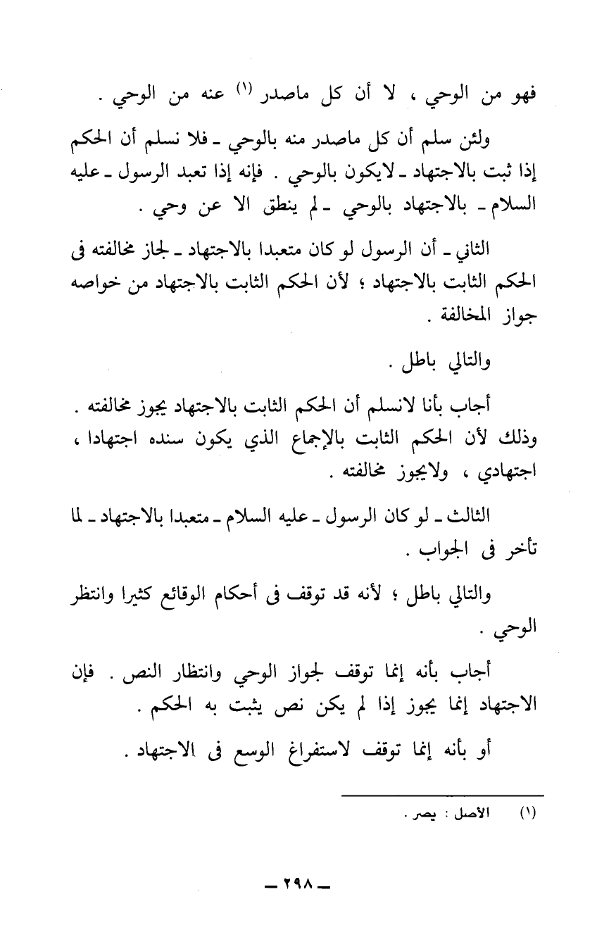 فَهُوَ مِنَ الْوَحْيِ، لَا أَنَّ كُلَّ مَا صَدَرَ عَنْهُ مِنَ الْوَحْيِ. وَلَئِنْ سُلِّمَ أَنَّ كُلَّ مَا صَدَرَ مِنْهُ بِالْوَحْيِ، فَلَا نُسَلِّمُ أَنَّ الْحُكْمَ إِذَا ثَبَتَ بِالِاجْتِهَادِ، لَا يَكُونُ بِالْوَحْيِ، فَإِنَّهُ إِذَا تَعَبَّدَ الرَّسُولُ - عَلَيْهِ السَّلَامُ - بِالِاجْتِهَادِ بِالْوَحْيِ، لَمْ يَنْطِقْ إِلَّا عَنْ وَحْيٍ.