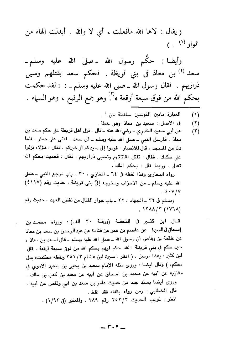 وَأَيْضًا: حَكَّمَ رَسُولُ اللَّهِ - صَلَّى اللَّهُ عَلَيْهِ وَسَلَّمَ - سَعْدَ بْنَ مُعَاذٍ فِي بَنِي قُرَيْظَةَ. فَحَكَمَ سَعْدٌ بِقَتْلِهِمْ وَسَبْيِ ذَرَارِيِّهِمْ. فَقَالَ رَسُولُ اللَّهِ - صَلَّى اللَّهُ عَلَيْهِ وَسَلَّمَ: " «لَقَدْ حَكَمْتَ بِحُكْمِ اللَّهِ مِنْ فَوْقِ سَبْعَةِ أَرْقِعَةٍ» "، وَهُوَ جَمْعُ الرَّقِيعِ، وَهُوَ السَّمَاءُ.
