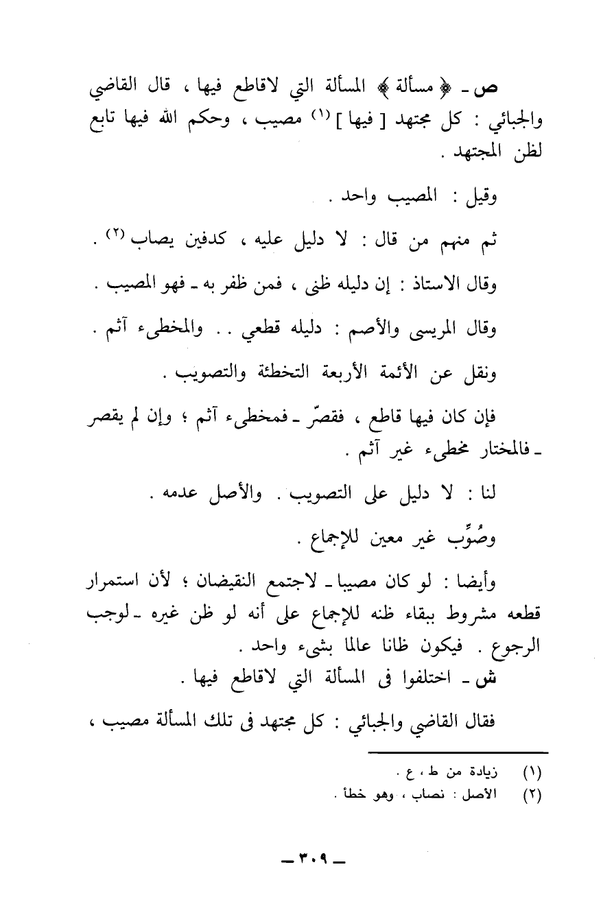 ص - (مَسْأَلَةٌ) : الْمَسْأَلَةُ الَّتِي لَا قَاطِعَ فِيهَا، قَالَ الْقَاضِي وَالْجِبَائِيُّ: كُلُّ مُجْتَهِدٍ فِيهَا مُصِيبٌ، وَحُكْمُ اللَّهِ فِيهَا تَابِعٌ لِظَنِّ الْمُجْتَهِدِ.