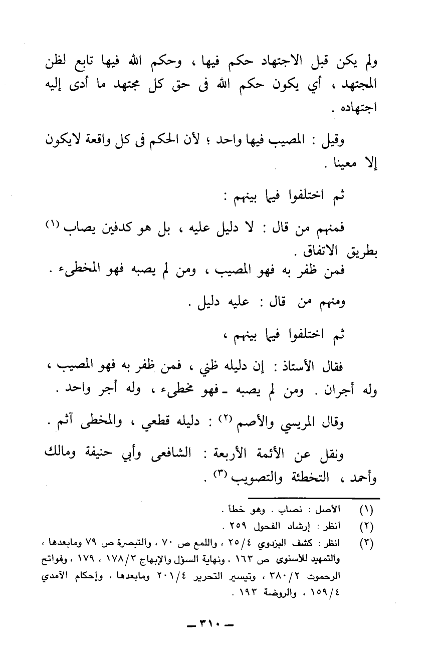 وَنُقِلَ عَنِ الْأَئِمَّةِ الْأَرْبَعَةِ الشَّافِعِيِّ وَأَبِي حَنِيفَةَ وَمَالِكٍ وَأَحْمَدَ التَّخْطِئَةُ وَالتَّصْوِيبُ.