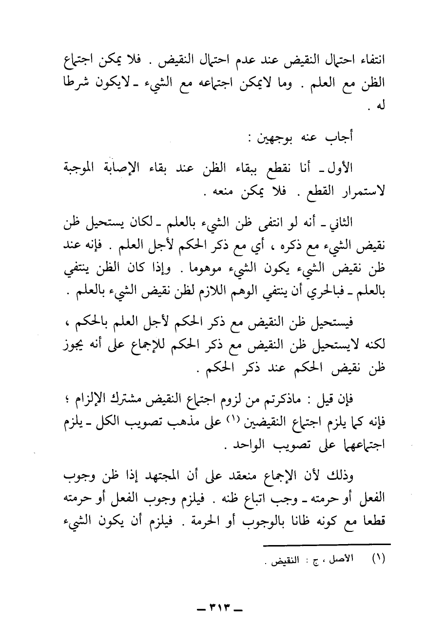 فَإِنْ قِيلَ: مَا ذَكَرْتُمْ مِنْ لُزُومِ اجْتِمَاعِ النَّقِيضِ مُشْتَرَكُ الْإِلْزَامِ، فَإِنَّهُ كَمَا يَلْزَمُ اجْتِمَاعُ النَّقِيضَيْنِ عَلَى مَذْهَبِ تَصْوِيبِ الْكُلِّ، يَلْزَمُ اجْتِمَاعُهُمَا عَلَى تَصْوِيبِ الْوَاحِدِ، وَذَلِكَ لِأَنَّ الْإِجْمَاعَ مُنْعَقِدٌ عَلَى أَنَّ الْمُجْتَهِدَ إِذَا ظَنَّ وُجُوبَ الْفِعْلِ أَوْ حُرْمَتَهُ، وَجَبَ اتِّبَاعُ ظَنِّهِ، فَيَلْزَمُ وُجُوبُ الْفِعْلِ أَوْ حُرْمَتُهُ قَطْعًا مَعَ كَوْنِهِ ظَانًّا بِالْوُجُوبِ أَوِ الْحُرْمَةِ. فَيَلْزَمُ أَنْ يَكُونَ الشَّيْءُ