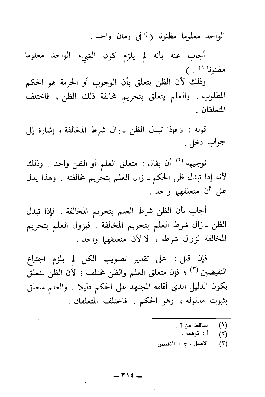 تَوْجِيهُهُ أَنْ يُقَالَ: مُتَعَلِّقُ الْعِلْمِ أَوِ الظَّنِّ وَاحِدٌ، وَذَلِكَ لِأَنَّهُ إِذَا تَبَدَّلَ ظَنُّ الْحُكْمِ، زَالَ الْعِلْمُ بِتَحْرِيمِ مُخَالَفَتِهِ، وَهَذَا يَدُلُّ عَلَى أَنَّ مُتَعَلِّقَهُمَا وَاحِدٌ.