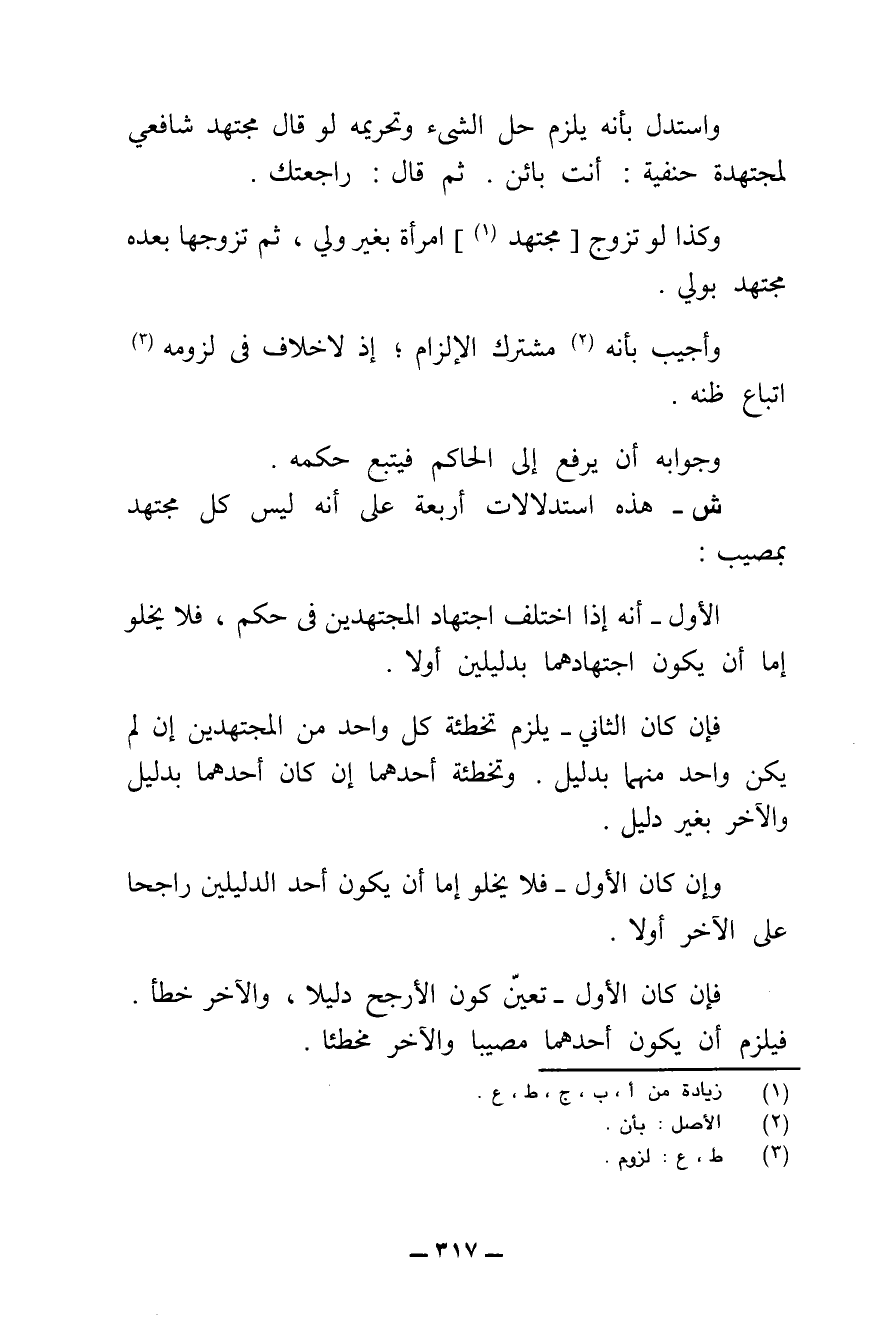 ص - الْمُصَوِّبَةُ قَالُوا: لَوْ كَانَ الْمُصِيبُ وَاحِدًا، لَوَجَبَ النَّقِيضَانِ، إِنْ كَانَ الْمَطْلُوبُ بَاقِيًا، أَوْ وَجَبَ الْخَطَأُ، إِنْ سَقَطَ