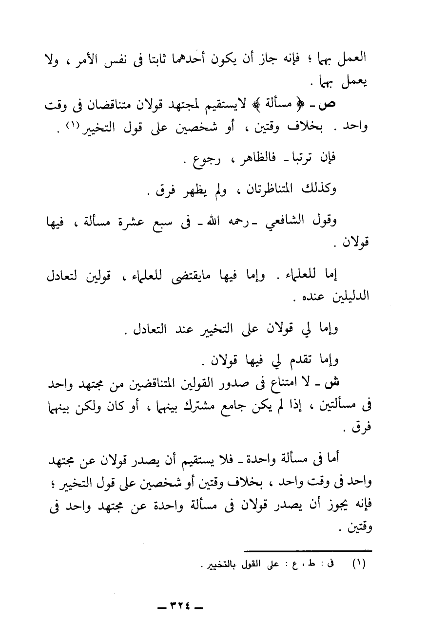 ش - لَا امْتِنَاعَ فَمَا صُدُورُ الْقَوْلَيْنِ الْمُتَنَاقِضَيْنِ مِنْ مُجْتَهِدٍ وَاحِدٍ فِي مَسْأَلَتَيْنِ، إِذَا لَمْ يَكُنْ جَامِعٌ مُشْتَرَكٌ بَيْنَهُمَا، أَوْ كَانَ وَلَكِنْ بَيْنَهُمَا فَرْقٌ.