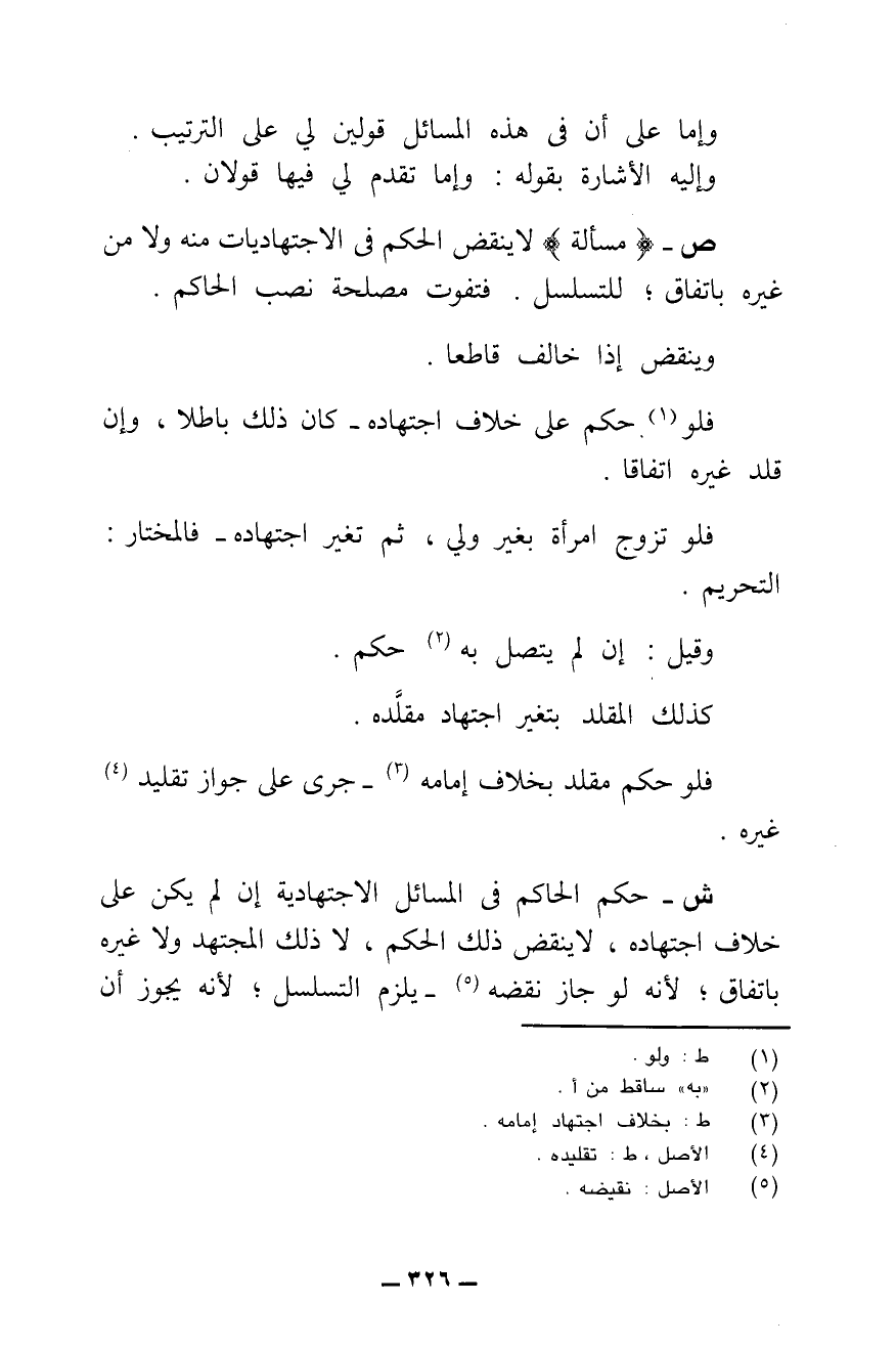 ش - حُكْمُ الْحَاكِمِ فِي الْمَسَائِلِ الِاجْتِهَادِيَّةِ إِنْ لَمْ يَكُنْ عَلَى خِلَافِ اجْتِهَادِهِ، لَا يَنْقُضُ ذَلِكَ الْحُكْمَ، لَا ذَلِكَ الْمُجْتَهِدُ وَلَا غَيْرُهُ بِاتِّفَاقٍ ; لِأَنَّهُ لَوْ جَازَ نَقْضُهُ، يَلْزَمُ التَّسَلْسُلُ ; لِأَنَّهُ يَجُوزُ أَنْ