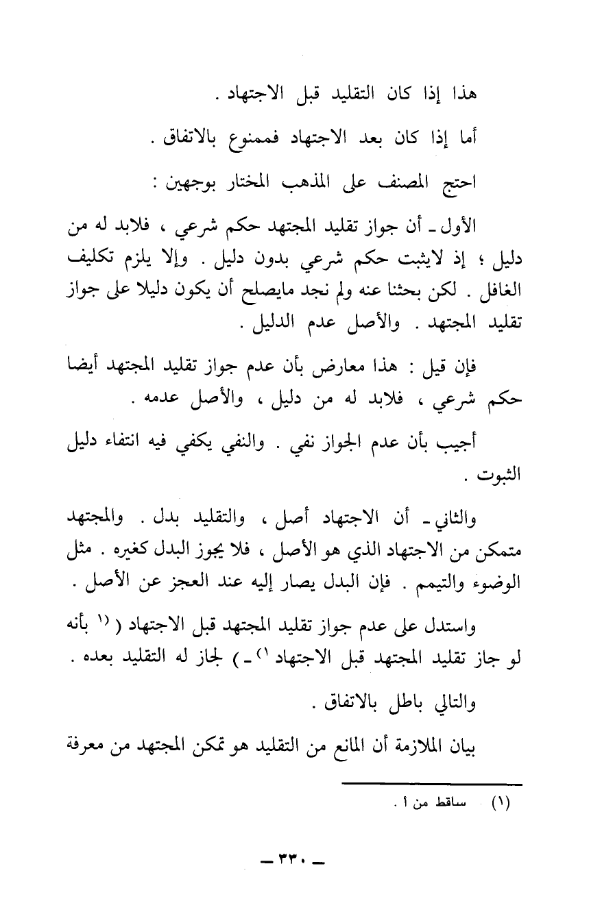 الْأَوَّلُ: أَنَّ جَوَازَ تَقْلِيدِ الْمُجْتَهِدِ حُكْمٌ شَرْعِيٌّ، فَلَا بُدَّ لَهُ مِنْ دَلِيلٍ، إِذْ لَا يَثْبُتُ حُكْمٌ شَرْعِيٌّ بِدُونِ دَلِيلٍ، وَإِلَّا يَلْزَمُ تَكْلِيفُ الْغَافِلِ، لَكِنْ بَحَثْنَا عَنْهُ وَلَمْ نَجِدْ مَا يَصْلُحُ أَنْ يَكُونَ دَلِيلًا عَلَى جَوَازِ تَقْلِيدِ الْمُجْتَهِدِ، وَالْأَصْلُ عَدَمُ الدَّلِيلِ.