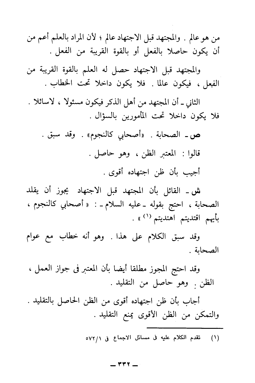 ش - الْقَائِلُ بِأَنَّ الْمُجْتَهِدَ قَبْلَ الِاجْتِهَادِ يَجُوزُ أَنْ يُقَلِّدَ الصَّحَابَةَ، احْتَجَّ بِقَوْلِهِ - عَلَيْهِ السَّلَامُ: " «أَصْحَابِي كَالنُّجُومِ، بِأَيِّهِمُ اقْتَدَيْتُمِ اهْتَدَيْتُمْ» ".