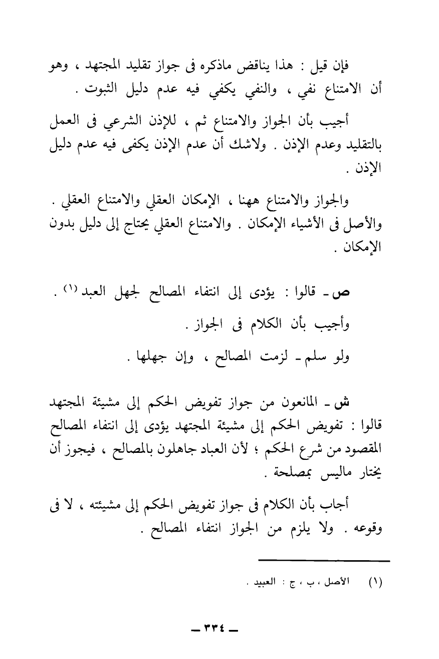 ش - الْمَانِعُونَ مِنْ جَوَازِ تَفْوِيضِ الْحُكْمِ إِلَى مَشِيئَةِ الْمُجْتَهِدِ قَالُوا: تَفْوِيضُ الْحُكْمِ إِلَى مَشِيئَةِ الْمُجْتَهِدِ يُؤَدِّي إِلَى انْتِفَاءِ الْمَصَالِحِ الْمَقْصُودِ مِنْ شَرْعِ الْحُكْمِ ; لِأَنَّ الْعِبَادَ جَاهِلُونَ بِالْمَصَالِحِ، فَيَجُوزُ أَنْ يَخْتَارَ مَا لَيْسَ بِمَصْلَحَةٍ.