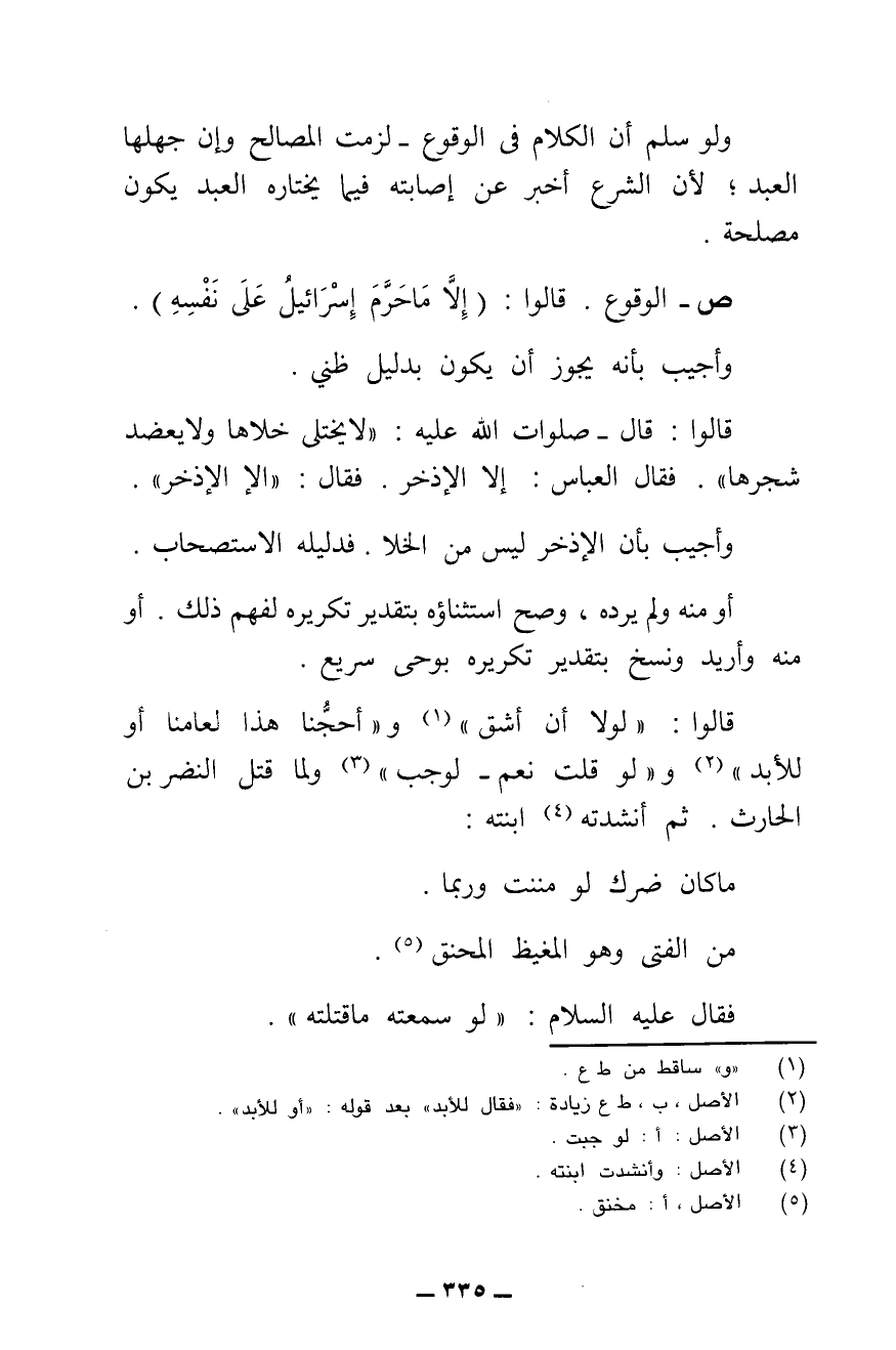 وَلَوْ سُلِّمَ أَنَّ الْكَلَامَ فِي الْوُقُوعِ، لَزِمَتِ الْمَصَالِحُ وَإِنْ جَهَلَهَا الْعَبْدُ ; لِأَنَّ الشَّرْعَ أَخْبَرَ عَنْ إِصَابَتِهِ فِيمَا يَخْتَارُهُ الْعَبْدُ يَكُونُ مَصْلَحَةً.