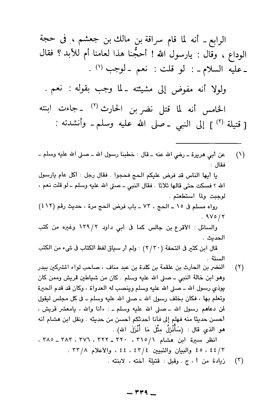 الرَّابِعُ: أَنَّهُ «لَمَّا قَامَ سُرَاقَةُ بْنُ مَالِكِ بْنِ جُعْشُمٍ، فِي حِجَّةِ الْوَدَاعِ، وَقَالَ: يَا رَسُولَ اللَّهِ، أَحَجُّنَا هَذَا لِعَامِنَا أَمْ لِلْأَبَدِ؟ فَقَالَ - عَلَيْهِ السَّلَامُ: لَوْ قُلْتُ نَعَمْ، لَوَجَبَ» .