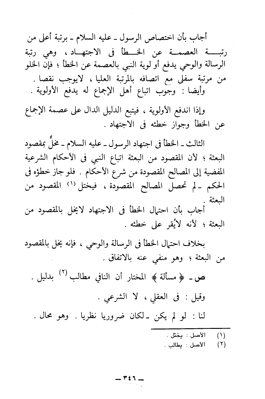 أَجَابَ بِأَنَّ اخْتِصَاصَ الرَّسُولِ - عَلَيْهِ السَّلَامُ - بِرُتْبَةٍ أَعْلَى مِنْ رُتْبَةِ الْعِصْمَةِ عَنِ الْخَطَأِ فِي الِاجْتِهَادِ، وَهِيَ رُتْبَةُ الرِّسَالَةِ وَالْوَحْيِ، يَدْفَعُ أَوْلَوِيَّةَ النَّبِيِّ بِالْعِصْمَةِ عَنِ الْخَطَأِ، فَإِنَّ الْخُلُوَّ مِنْ مَرْتَبَةٍ سُفْلَى مَعَ اتِّصَافِهِ بِالْمَرْتَبَةِ الْعُلْيَا لَا يُوجِبُ نَقْصًا.