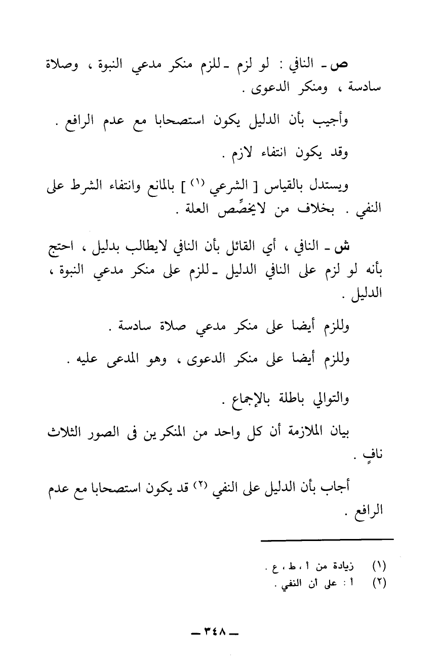 ش - النَّافِي، أَيِ الْقَائِلُ بِأَنَّ النَّافِيَ لَا يُطَالَبُ بِدَلِيلٍ، احْتَجَّ بِأَنَّهُ لَوْ لَزِمَ عَلَى النَّافِي الدَّلِيلُ، لَلَزِمَ عَلَى مُنْكِرِ مُدَّعِي النُّبُوَّةَ الدَّلِيلُ، وَلَلَزِمَ أَيْضًا عَلَى مُنْكَرِ مُدَّعِي صَلَاةٍ سَادِسَةٍ، وَلَلَزِمَ أَيْضًا عَلَى مُنْكَرِ الدَّعْوَى، وَهُوَ الْمُدَّعَى عَلَيْهِ.