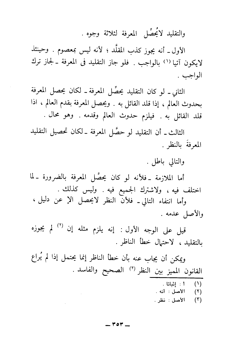 وَالتَّقْلِيدُ لَا يُحَصِّلُ الْمَعْرِفَةَ لِثَلَاثَةِ وُجُوهٍ: