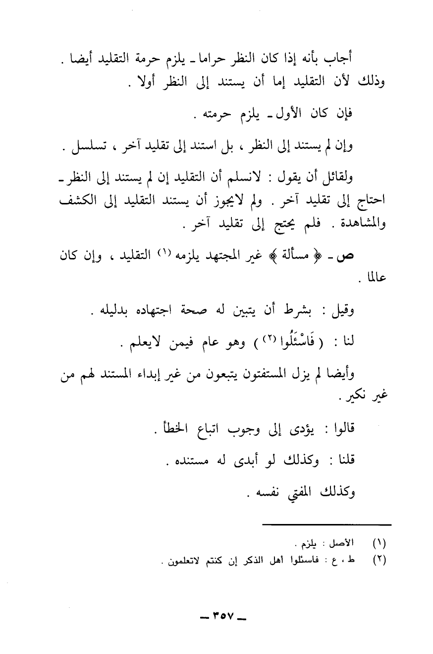 فَإِنْ كَانَ الْأَوَّلَ، يَلْزَمُ حُرْمَتُهُ، وَإِنْ لَمْ يَسْتَنِدْ إِلَى النَّظَرِ، بَلِ اسْتَنَدَ إِلَى تَقْلِيدٍ آخَرَ، تَسَلْسَلَ. وَلِقَائِلٍ أَنْ يَقُولَ: لَا نُسَلِّمُ أَنَّ التَّقْلِيدَ إِنْ لَمْ يَسْتَنِدْ إِلَى النَّظَرِ، احْتَاجَ إِلَى تَقْلِيدٍ آخَرَ، وَلِمَ لَا يَجُوزُ أَنْ يَسْتَنِدَ التَّقْلِيدُ إِلَى الْكَشْفِ وَالْمُشَاهَدَةِ، فَلَمْ يَحْتَجْ إِلَى تَقْلِيدٍ آخَرَ.
