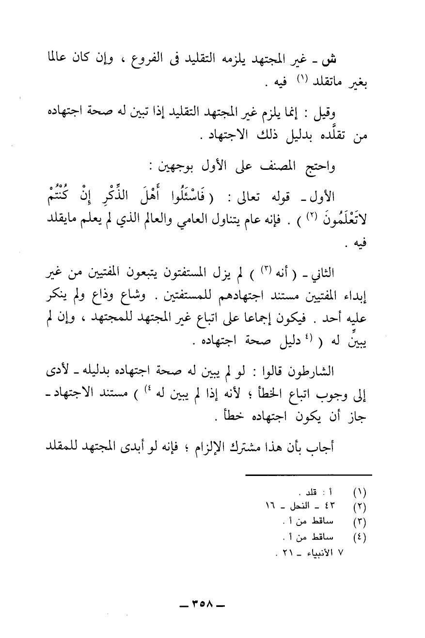 الْأَوَّلُ: قَوْلُهُ - تَعَالَى: {فَاسْأَلُوا أَهْلَ الذِّكْرِ إِنْ كُنْتُمْ لَا تَعْلَمُونَ} [النحل: ٤٣] . فَإِنَّهُ عَامٌّ يَتَنَاوَلُ الْعَامِّيَّ وَالْعَالِمَ الَّذِي لَمْ يَعْلَمْ مَا يُقَلِّدُ فِيهِ.