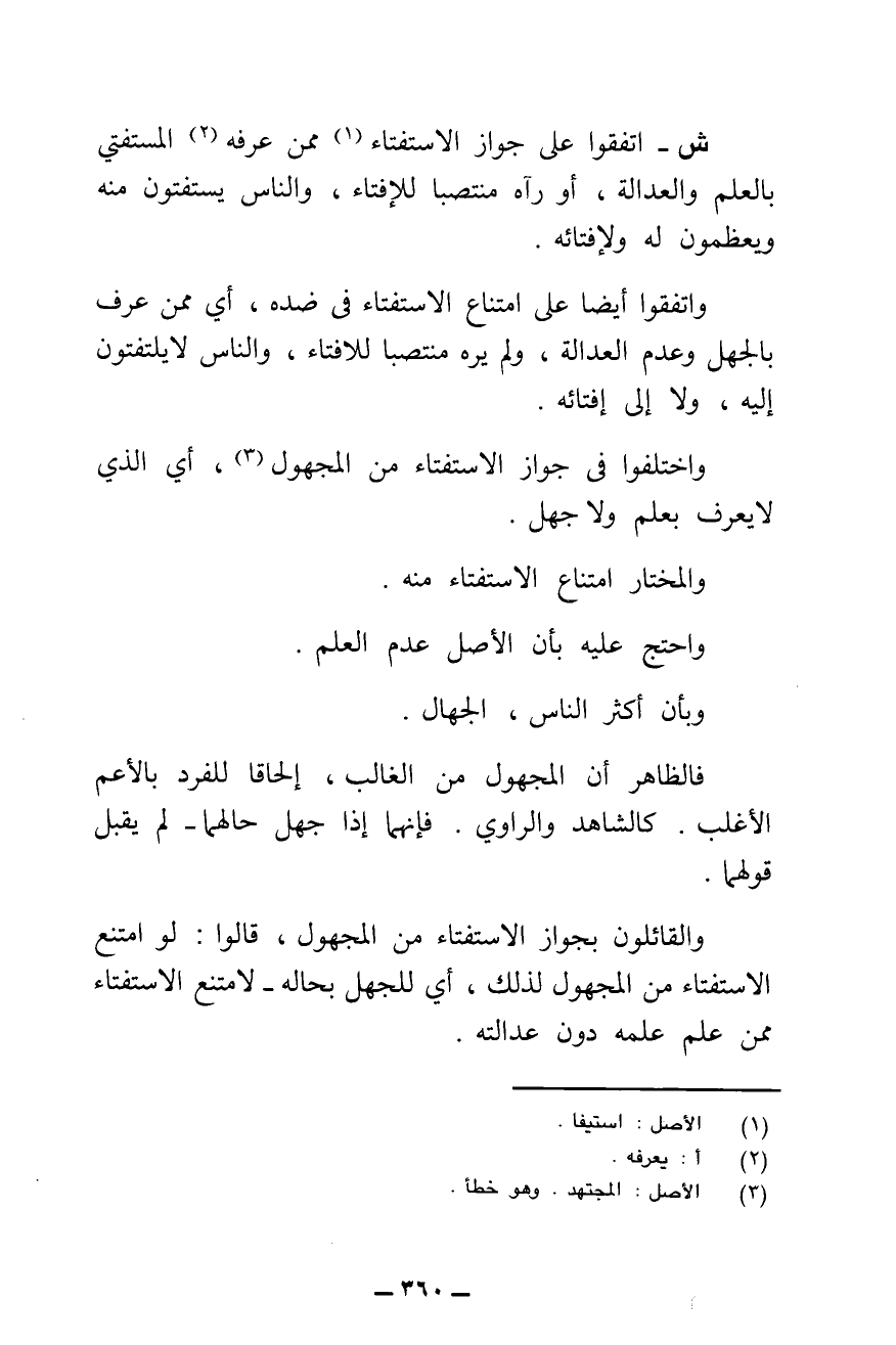 ش - اتَّفَقُوا عَلَى جَوَازِ الِاسْتِفْتَاءِ مِمَّنْ عَرَفَهُ الْمُسْتَفْتِي بِالْعِلْمِ وَالْعَدَالَةِ، أَوْ رَآهُ مُنْتَصِبًا لِلْإِفْتَاءِ، وَالنَّاسُ يَسْتَفْتُونَ مِنْهُ وَيُعَظِّمُونَ لَهُ وَلِإِفْتَائِهِ.