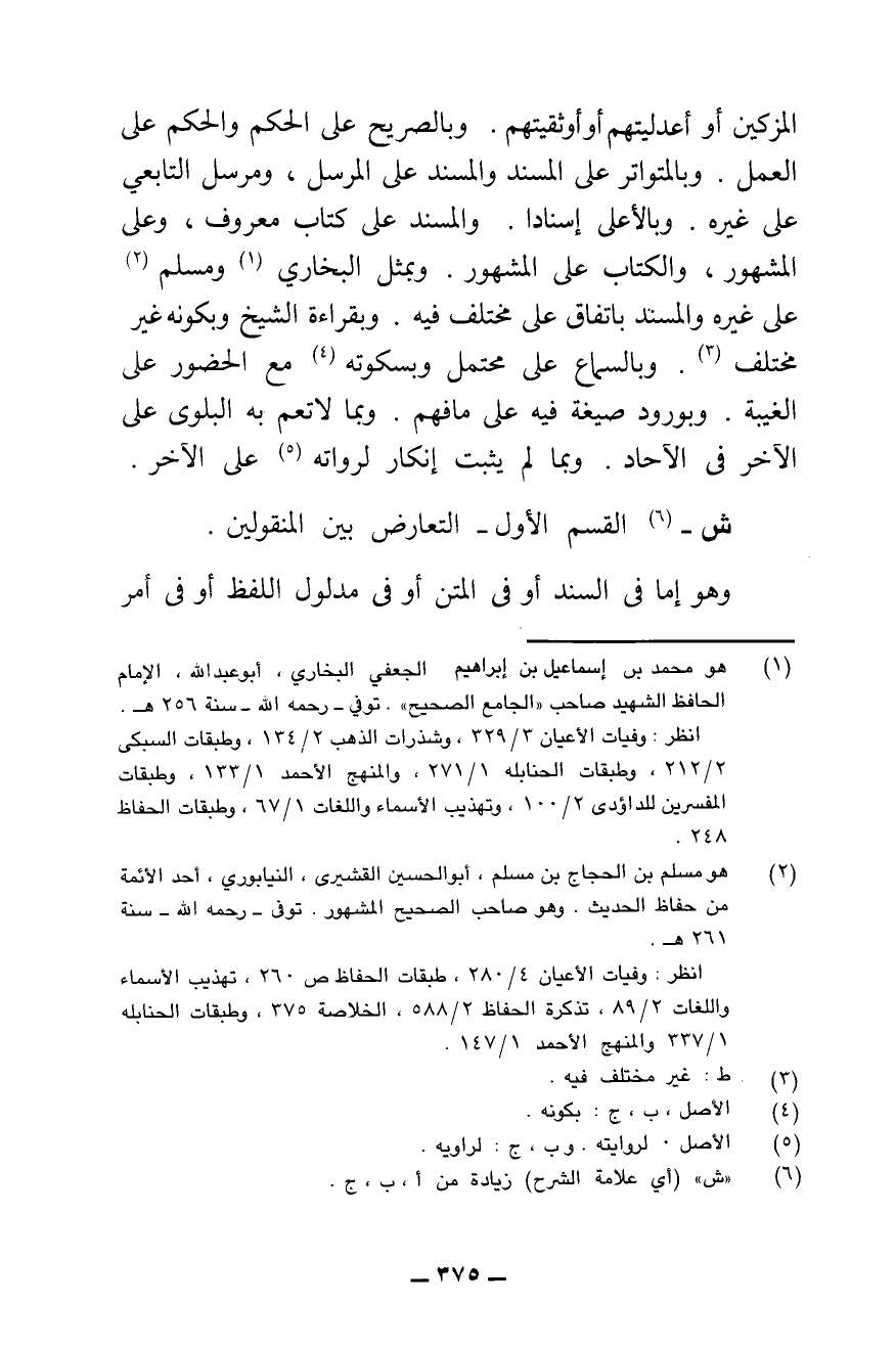 الْمُزَكِّينَ أَوْ أَعْدَلِيَّتِهِمْ أَوْ أَوْثَقِيَّتِهِمْ. وَبِالصَّرِيحِ عَلَى الْحُكْمِ وَالْحُكْمِ عَلَى الْعَمَلِ. وَبِالْمُتَوَاتِرِ عَلَى الْمُسْنَدِ وَالْمُسْنَدِ عَلَى الْمُرْسَلِ، وَمُرْسَلِ التَّابِعِيِّ عَلَى غَيْرِهِ، وَبِالْأَعْلَى إِسْنَادًا، وَالْمُسْنَدِ عَلَى كِتَابٍ مَعْرُوفٍ، وَعَلَى الْمَشْهُورِ، وَالْكِتَابِ عَلَى الْمَشْهُورِ، وَبِمِثْلِ الْبُخَارِيِّ وَمُسْلِمٍ عَلَى غَيْرِهِ، وَالْمُسْتَنَدِ بِاتِّفَاقٍ عَلَى مُخْتَلَفٍ فِيهِ، وَبِقِرَاءَةِ الشَّيْخِ وَبِكَوْنِهِ غَيْرَ مُخْتَلِفٍ، وَبِالسَّمَاعِ عَلَى مُحْتَمَلٍ، وَبِسُكُوتِهِ مَعَ الْحُضُورِ عَلَى الْغَيْبَةِ، وَبِوُرُودِ صِيغَةٍ فِيهِ عَلَى مَا فُهِمَ، وَبِمَا لَا تَعُمُّ بِهِ الْبَلْوَى عَلَى الْآخَرِ فِي الْآحَادِ، وَبِمَا لَمْ يَثْبُتْ إِنْكَارٌ لِرُوَاتِهِ عَلَى الْآخَرِ.