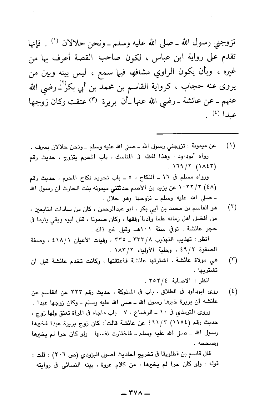 «تَزَوَّجَنِي رَسُولُ اللَّهِ - صَلَّى اللَّهُ عَلَيْهِ وَسَلَّمَ - وَنَحْنُ حَلَالَانِ» . فَإِنَّهَا تُقَدَّمُ عَلَى رِوَايَةِ ابْنِ عَبَّاسٍ ; لِكَوْنِ صَاحِبِ الْقِصَّةِ أَعْرَفَ بِهَا مِنْ غَيْرِهِ، وَبِأَنْ يَكُونَ الرَّاوِي مُشَافِهًا فِيمَا سَمِعَ، لَيْسَ بَيْنَهُ وَبَيْنَ مَنْ يَرْوِي عَنْهُ حِجَابٌ، كَرِوَايَةِ الْقَاسِمِ بْنِ مُحَمَّدِ بْنِ أَبِي بَكْرٍ - رَضِيَ اللَّهُ عَنْهُمْ - عَنْ عَائِشَةَ - رَضِيَ اللَّهُ عَنْهَا: أَنْ بَرِيرَةَ عُتِقَتْ وَكَانَ زَوْجُهَا عَبْدًا.