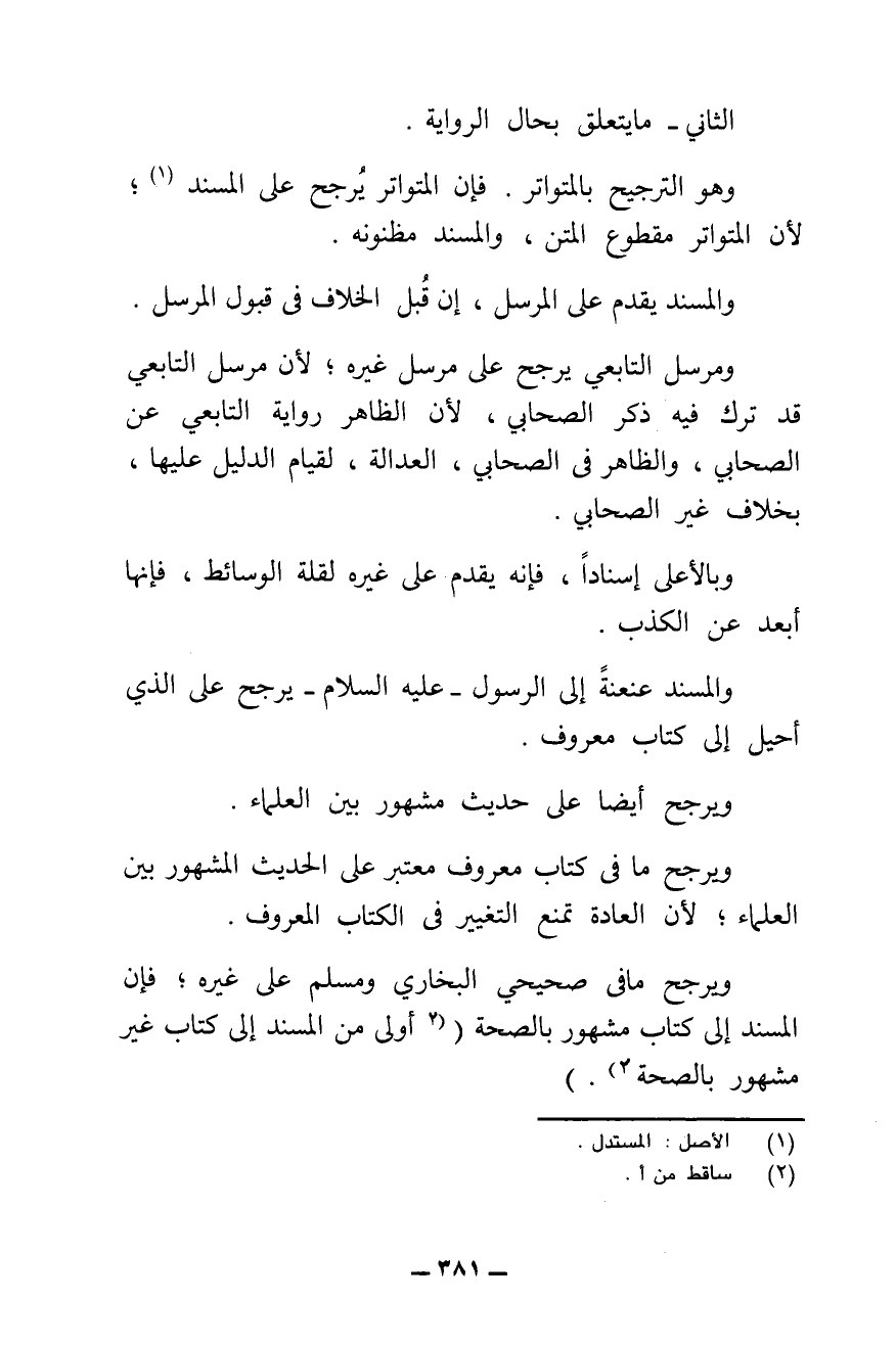 الْمُسْنَدُ عَنْعَنَةً إِلَى الرَّسُولِ - عَلَيْهِ السَّلَامُ - يُرَجَّحُ عَلَى الَّذِي أُحِيلَ إِلَى كِتَابٍ مَعْرُوفٍ، وَيُرَجَّحُ أَيْضًا عَلَى حَدِيثٍ مَشْهُورٍ بَيْنَ الْعُلَمَاءِ، وَيُرَجَّحُ مَا فِي كِتَابٍ مَعْرُوفٍ مُعْتَبَرٍ عَلَى الْحَدِيثِ الْمَشْهُورِ بَيْنَ الْعُلَمَاءِ ; لِأَنَّ الْعَادَةَ تَمْنَعُ التَّغْيِيرَ فِي الْكِتَابِ الْمَعْرُوفِ.