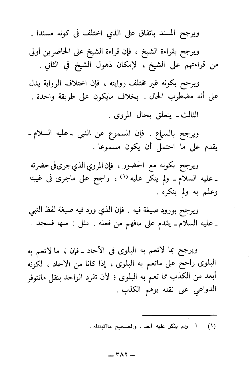 الثَّالِثُ: يَتَعَلَّقُ بِحَالِ الْمَرْوِيِّ، وَيُرَجَّحُ بِالسَّمَاعِ، فَإِنَّ الْمَسْمُوعَ عَنِ النَّبِيِّ - عَلَيْهِ السَّلَامُ - يُقَدَّمُ عَلَى مَا احْتُمِلَ أَنْ يَكُونَ مَسْمُوعًا.