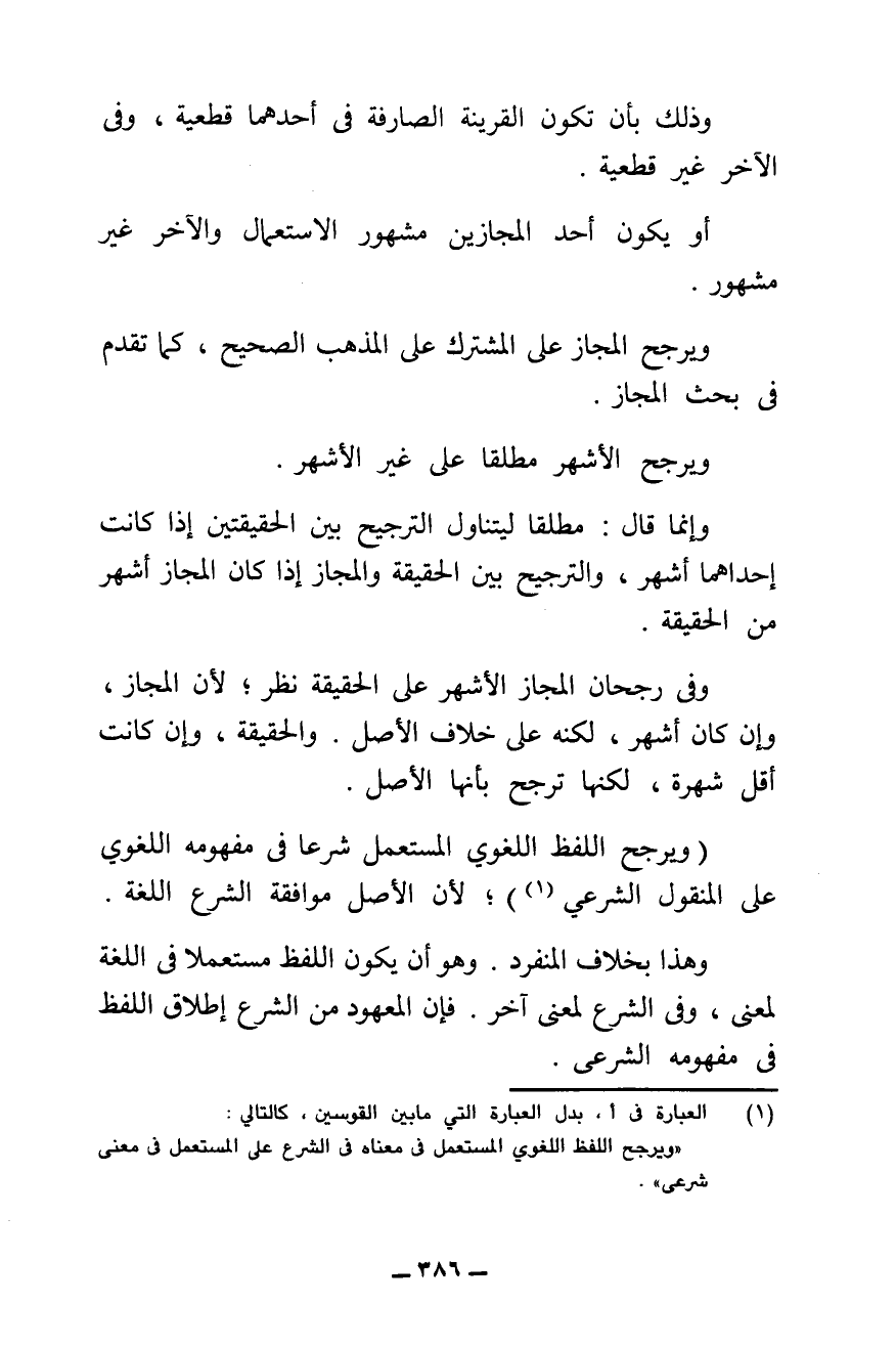 أَوْ يَكُونُ أَحَدُ الْمَجَازَيْنِ مَشْهُورَ الِاسْتِعْمَالِ وَالْآخِرُ غَيْرَ مَشْهُورٍ، وَيُرَجَّحُ الْمَجَازُ عَلَى الْمُشْتَرَكِ عَلَى الْمَذْهَبِ الصَّحِيحِ، كَمَا تَقَدَّمَ فِي بَحْثِ الْمَجَازِ، وَيُرَجَّحُ الْأَشْهُرُ مُطْلَقًا عَلَى غَيْرِ الْأَشْهُرِ.