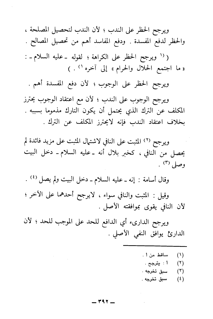 وَيُرَجَّحُ الْحَظْرُ عَلَى النَّدْبِ ; لِأَنَّ النَّدْبَ لِتَحْصِيلِ الْمَصْلَحَةِ، وَالْحَظْرَ لِدَفْعِ الْمَفْسَدَةِ، وَدَفْعُ الْمَفَاسِدِ أَهَمُّ مِنْ تَحْصِيلِ الْمَصَالِحِ.