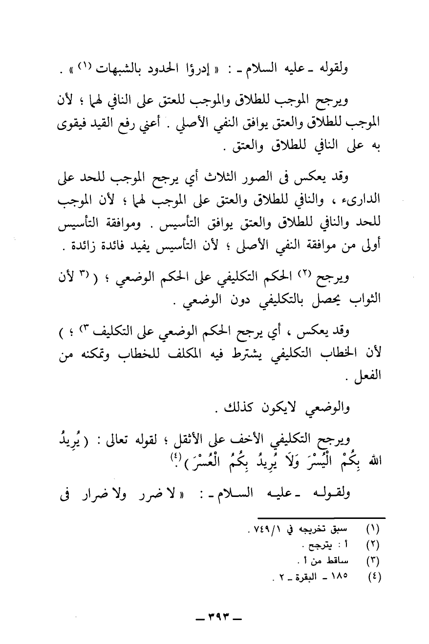وَلِقَوْلِهِ - عَلَيْهِ السَّلَامُ: " «ادْرَءُوا الْحُدُودَ بِالشُّبَهَاتِ» . وَيُرَجَّحُ الْمُوجِبُ لِلطَّلَاقِ وَالْمُوجِبُ لِلْعِتْقِ عَلَى النَّافِي لَهُمَا ; لِأَنَّ الْمُوجِبَ لِلطَّلَاقِ وَالْعِتْقِ يُوَافِقُ النَّفْيَ الْأَصْلِيَّ، أَعْنِي رَفْعَ الْقَيْدِ فَيَقْوَى بِهِ عَلَى النَّافِي لِلطَّلَاقِ وَالْعِتْقِ.