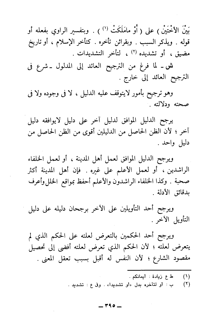 {وَأَنْ تَجْمَعُوا بَيْنَ الْأُخْتَيْنِ} [النساء: ٢٣] عَلَى (أَوْ مَا مَلَكَتْ) . وَبِتَفْسِيرِ الرَّاوِي بِفِعْلِهِ أَوْ قَوْلِهِ، وَيَذْكُرُ السَّبَبَ، وَبِقَرَائِنِ تَأَخُّرِهِ كَتَأَخُّرِ الْإِسْلَامِ، أَوْ تَارِيخٍ مُضَيَّقٍ، أَوْ تَشْدِيدِهِ، لِتَأَخُّرِ التَّشْدِيدَاتِ.