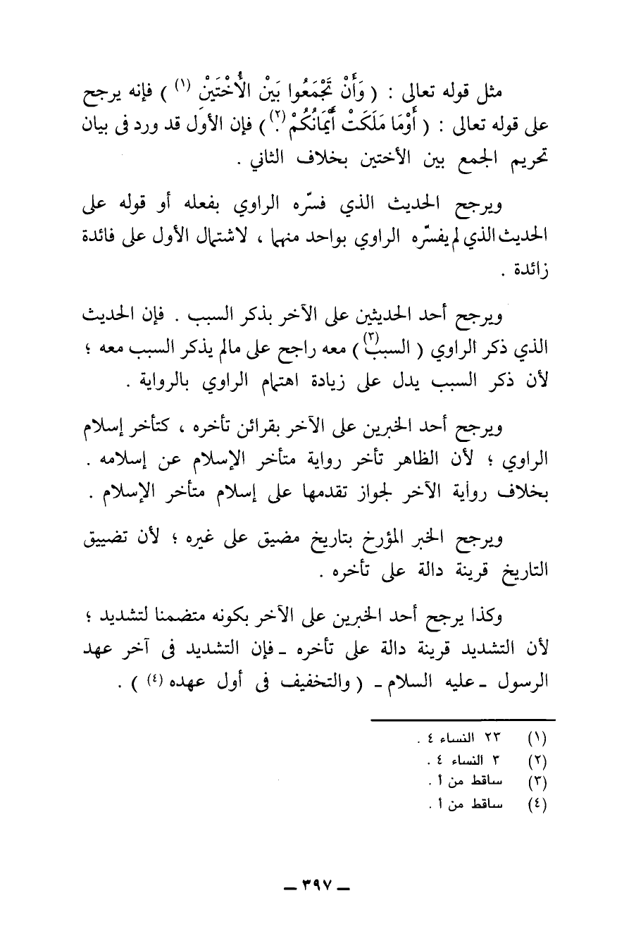 مِثْلُ قَوْلِهِ - تَعَالَى: {وَأَنْ تَجْمَعُوا بَيْنَ الْأُخْتَيْنِ} [النساء: ٢٣] ، فَإِنَّهُ يُرَجَّحُ عَلَى قَوْلِهِ - تَعَالَى: {أَوْ مَا مَلَكَتْ أَيْمَانُكُمْ} [النساء: ٣] . فَإِنَّ الْأَوَّلَ قَدْ وَرَدَ فِي بَيَانِ تَحْرِيمِ الْجَمْعِ بَيْنَ الْأُخْتَيْنِ بِخِلَافِ الثَّانِي.