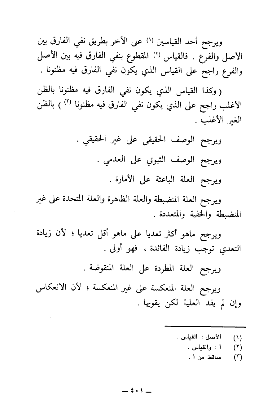 وَيُرَجَّحُ أَحَدُ الْقِيَاسَيْنِ عَلَى الْآخَرِ بِطْرِيقِ نَفْيِ الْفَارِقِ بَيْنَ الْأَصْلِ وَالْفَرْعِ. فَالْقِيَاسُ الْمَقْطُوعُ بِنَفْيِ الْفَارِقِ فِيهِ بَيْنَ الْأَصْلِ وَالْفَرْعِ رَاجِحٌ عَلَى الْقِيَاسِ الَّذِي يَكُونُ نَفْيُ الْفَارِقِ فِيهِ مَظْنُونًا، وَكَذَا الْقِيَاسُ الَّذِي يَكُونُ نَفْيُ الْفَارِقِ فِيهِ مَظْنُونًا بِالظَّنِّ الْأَغْلَبِ، رَاجِحٌ عَلَى الَّذِي يَكُونُ نَفْيُ الْفَارِقِ فِيهِ مَظْنُونًا بِالظَّنِّ الْغَيْرِ الْأَغْلَبِ.