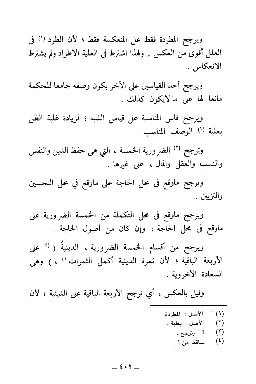 وَيُرَجَّحُ قِيَاسُ الْمُنَاسَبَةِ عَلَى قِيَاسِ الشَّبَهِ ; لِزِيَادَةِ غَلَبَةِ الظَّنِّ بِعَلِيَّةِ الْوَصْفِ الْمُنَاسِبِ، وَتُرَجَّحُ الضَّرُورِيَّةُ الْخَمْسَةُ، الَّتِي هِيَ حِفْظُ الدِّينِ وَالنَّفْسِ وَالنَّسَبِ وَالْعَقْلِ وَالْمَالِ، عَلَى غَيْرِهَا.