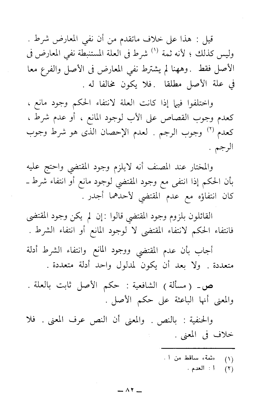 وَاخْتَلَفُوا فِيمَا إِذَا كَانَتِ الْعِلَّةُ لِانْتِفَاءِ الْحُكْمِ وُجُودِ مَانِعٍ، كَعَدَمِ وُجُوبِ الْقِصَاصِ عَلَى الْأَبِّ لِوُجُودِ الْمَانِعِ، أَوْ عَدَمِ شَرْطٍ، كَعَدَمِ وُجُوبِ الرَّجْمِ ; لِعَدَمِ الْإِحْصَانِ الَّذِي هُوَ شَرْطُ وُجُوبِ الرَّجْمِ.