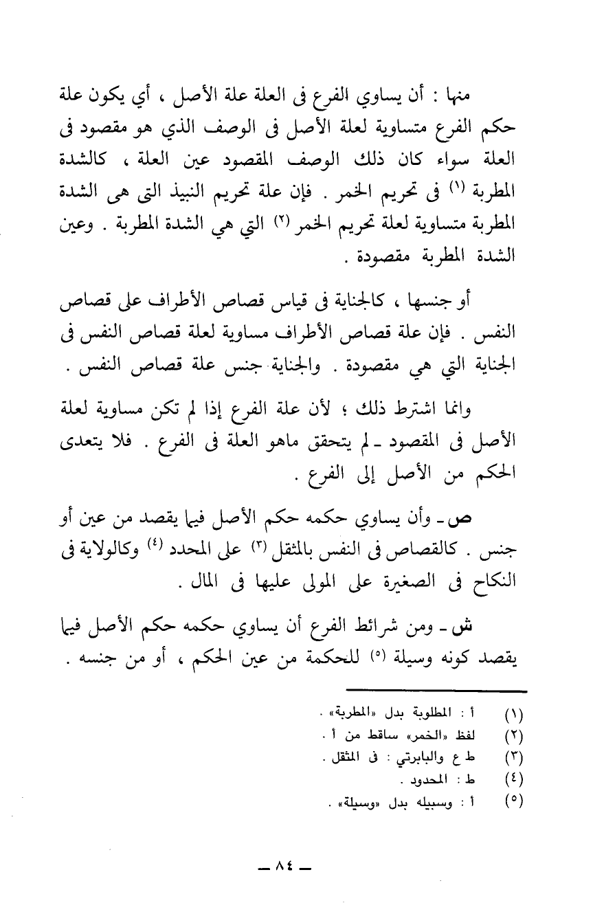 مِنْهَا: أَنْ يُسَاوِيَ الْفَرْعُ فِي الْعِلَّةِ عِلَّةَ الْأَصْلِ، أَيْ يَكُونُ عِلَّةُ حُكْمِ الْفَرْعِ مُتَسَاوِيَةً لِعِلَّةِ الْأَصْلِ فِي الْوَصْفِ الَّذِي هُوَ مَقْصُودٌ فِي الْعِلَّةِ، سَوَاءٌ كَانَ ذَلِكَ الْوَصْفُ الْمَقْصُودُ عَيْنَ الْعِلَّةِ، كَالشِّدَّةِ الْمُطْرِبَةِ فِي تَحْرِيمِ الْخَمْرِ، فَإِنَّ عِلَّةَ تَحْرِيمِ النَّبِيذِ الَّتِي هِيَ الشِّدَّةُ الْمُطْرِبَةُ مُتَسَاوِيَةٌ لِعِلَّةِ تَحْرِيمِ الْخَمْرِ الَّتِي هِيَ الشِّدَّةُ الْمُطْرِبَةُ، وَعَيْنُ الشِّدَّةِ الْمُطْرِبَةِ مَقْصُودَةٌ.