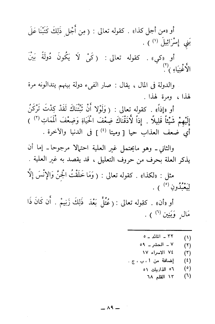 أَوْ " كَيْ "، كَقَوْلِهِ - تَعَالَى: {كَيْ لَا يَكُونَ دُولَةً بَيْنَ الْأَغْنِيَاءِ} [الحشر: ٧] . وَالدُّولَةُ فِي الْمَالِ، يُقَالُ: صَارَ الْفَيْءُ دُولَةً بَيْنَهُمْ يَتَدَاوَلُونَهُ مَرَّةً لِهَذَا، وَمَرَّةً لِهَذَا.