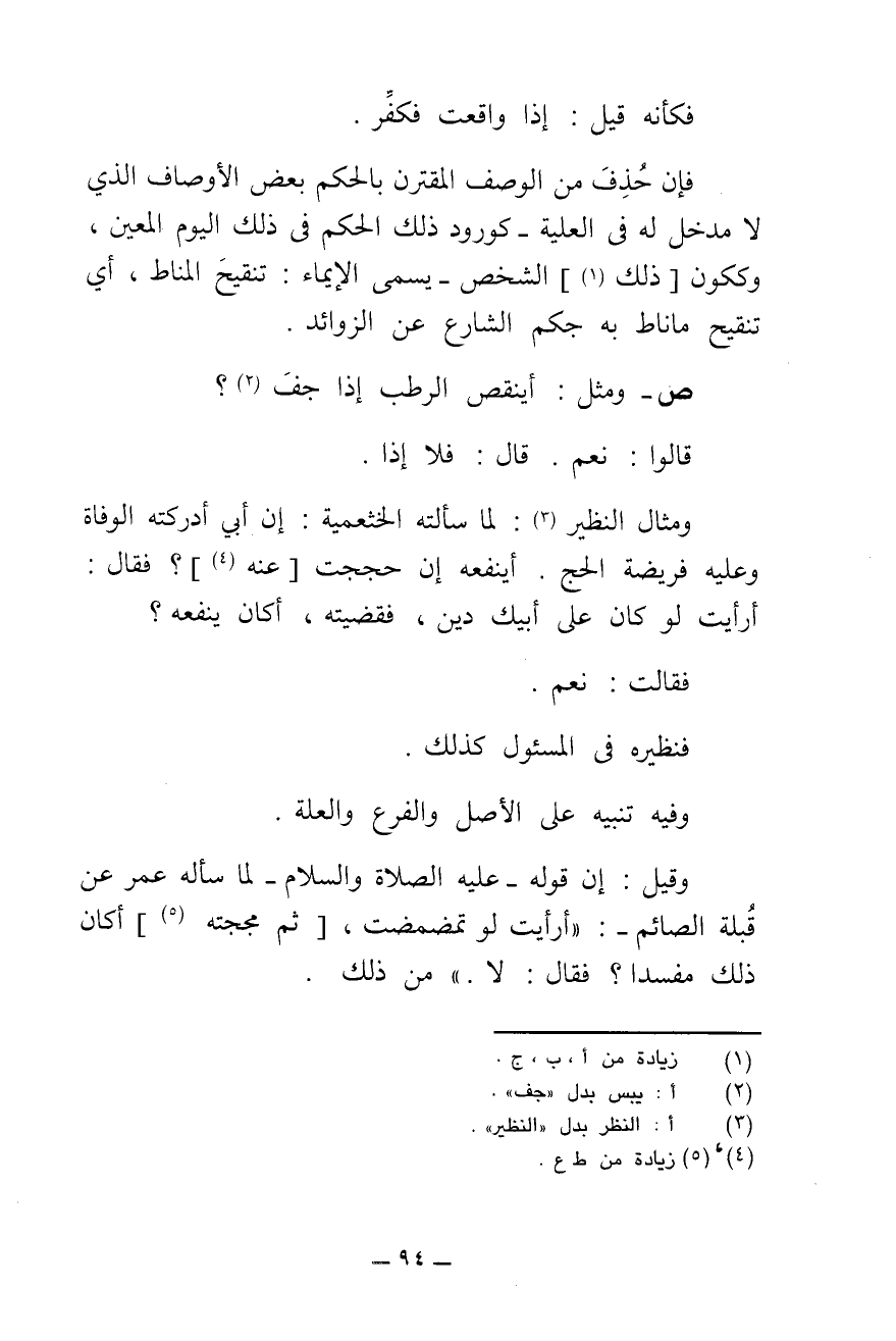فَإِنْ حُذِفَ مِنَ الْوَصْفِ الْمُقْتَرِنِ بِالْحُكْمِ بَعْضُ الْأَوْصَافِ الَّذِي لَا مَدْخَلَ لَهُ فِي الْعِلِّيَّةِ، كَوُرُودِ ذَلِكَ الْحُكْمِ فِي ذَلِكَ الْيَوْمِ الْمُعَيَّنِ، وَكَكَوْنِ ذَلِكَ الشَّخْصِ يُسَمِّي الْإِيمَاءَ: تَنْقِيحَ الْمَنَاطِ، أَيْ تَنْقِيحَ مَا نَاطَ بِهِ حُكْمُ الشَّارِعِ عَنِ الزَّوَائِدِ.