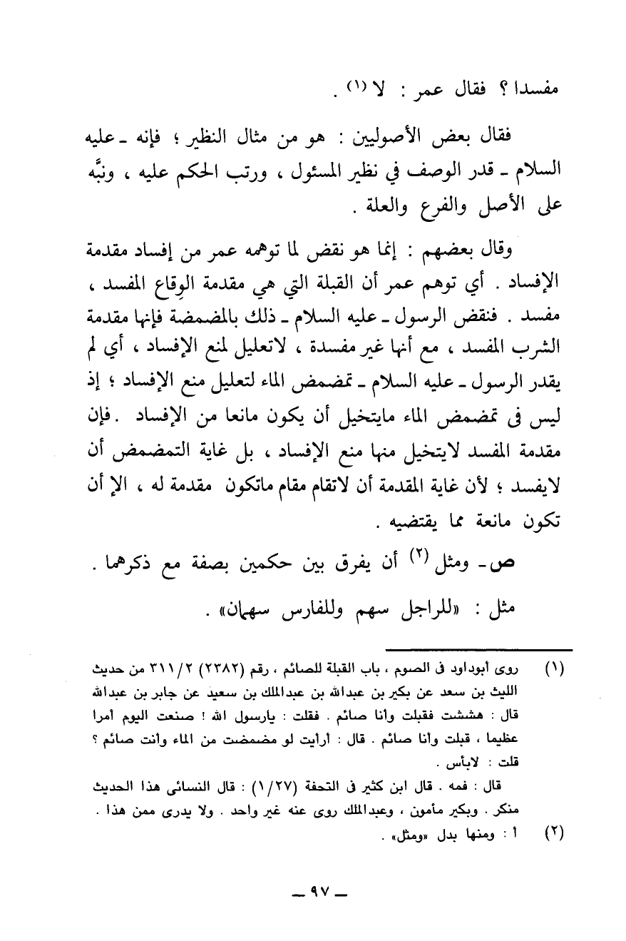 » فَقَالَ بَعْضُ الْأُصُولِيِّينَ: هُوَ مِنْ مِثَالِ النَّظِيرِ، فَإِنَّهُ - عَلَيْهِ السَّلَامُ - قَدَّرَ الْوَصْفَ فِي نَظِيرِ الْمَسْئُولِ، وَرَتَّبَ الْحُكْمُ عَلَيْهِ، وَنَبَّهَ عَلَى الْأَصْلِ وَالْفَرْعِ وَالْعِلَّةِ.