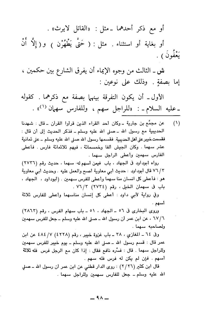 أَوْ مَعَ ذِكْرِ أَحَدِهِمَا، مِثْلُ: " الْقَاتِلُ لَا يَرِثُ "، أَوْ بِغَايَةٍ أَوِ اسْتِثْنَاءٍ، مِثْلُ: (حَتَّى يَطْهُرْنَ) وَ (إِلَّا أَنْ يَعْفُونَ) .