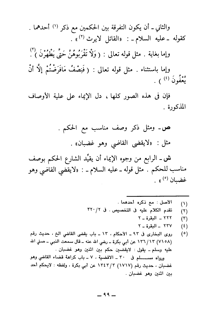 ش - الرَّابِعُ مِنْ وُجُوهِ الْإِيمَاءِ: أَنْ يُقَيِّدَ الشَّارِعُ الْحُكْمَ بِوَصْفٍ مُنَاسِبٍ لِلْحُكْمِ، مِثْلَ قَوْلِهِ - عَلَيْهِ السَّلَامُ: «لَا يَقْضِي الْقَاضِي وَهُوَ غَضْبَانُ ".