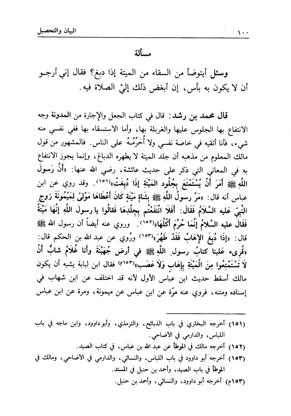 قال محمد بن رشد: قال في كتاب الجعل والإجارة من المدونة: وجه الانتفاع بها الجلوس عليها والغربلة بها، وأما الاستسقاء بها ففي نفسي منه شيء، فأنا أتقيه في خاصة نفسي ولا أحرمه على الناس. فالمشهور من قول مالك المعلوم من مذهبه أن جلد الميتة لا يطهره الدباغ، وإنما يجوز الانتفاع به في المعاني التي ذكر على حديث عائشة، - رَضِيَ اللَّهُ عَنْهَا -: «أن رسول الله - صَلَّى اللَّهُ عَلَيْهِ وَسَلَّمَ - أمر أن يستمتع بجلود الميتة إذا دبغت» . وقد روي عن ابن عباس أنه قال: «مر رسول الله - صَلَّى اللَّهُ عَلَيْهِ وَسَلَّمَ - بشاة ميتة كان أعطاها مولى لميمونة زوج النبي - عَلَيْهِ السَّلَامُ - فقال: أفلا انتفعتم بجلدها؟ فقالوا: يا رسول الله، إنها ميتة، فقال - عَلَيْهِ السَّلَامُ -: إنما حرم أكلها» . وروي عنه أيضا أن رسول الله - صَلَّى اللَّهُ عَلَيْهِ وَسَلَّمَ - قال: «إذا دبغ الإهاب فقد طهر» وروي عن عبد الله بن الحكم قال: «قرئ علينا كتاب رسول الله - صَلَّى اللَّهُ عَلَيْهِ وَسَلَّمَ - في أرض جهينة وأنا غلام شاب أن لا تستمتعوا من الميتة بإهاب ولا عصب» فقال ابن لبابة: يشبه أن يكون مالك أسقط حديث ابن عباس الأول؛ لأنه قد اختلف عن ابن شهاب في إسناده ومتنه، فروي عنه مرة عن ابن عباس عن ميمونة، ومرة عن ابن عباس