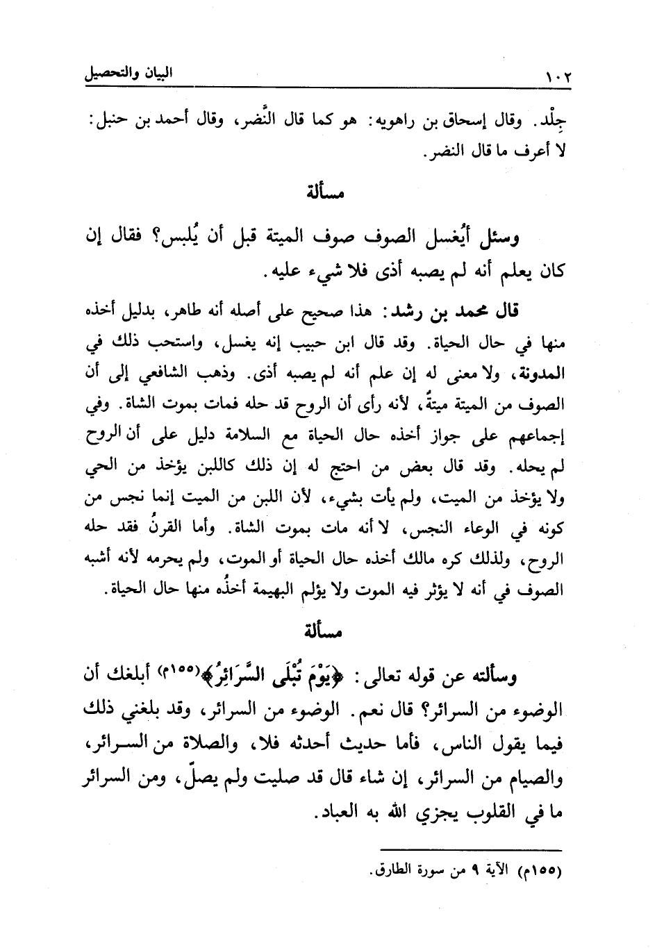مسألة وسألته عن قَوْله تَعَالَى: {يَوْمَ تُبْلَى السَّرَائِرُ} [الطارق: 9] أبلغك أن الوضوء من السرائر؟ قال: نعم. الوضوء من السرائر، وقد بلغني ذلك فيما يقول الناس، فأما حديث أحدثه فلا، والصلاة من السرائر، والصيام من السرائر، إن شاء قال: قد صليت ولم يصل، ومن السرائر ما في القلوب يجزي الله به العباد.
