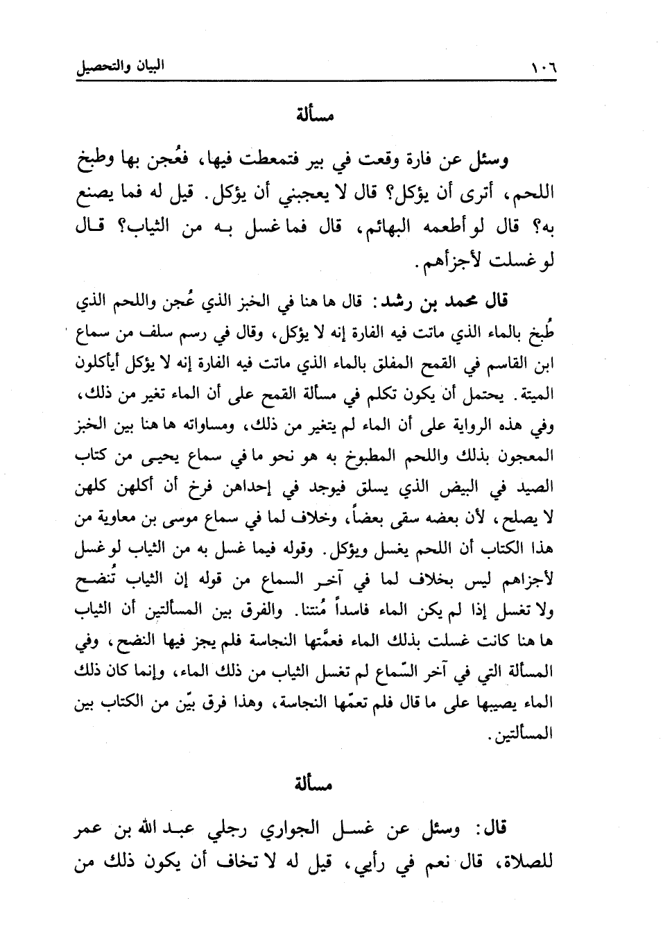 مسألة وسئل عن فارة وقعت في بير فتمعطت فيها، فعجن بها وطبخ اللحم، أترى أن يؤكل؟ قال: لا يعجبني أن يؤكل. قيل له: فما يصنع به؟ قال: لو أطعمه البهائم، قال: فما غسل به من الثياب؟ قال: لو غسلت لأجزأهم.