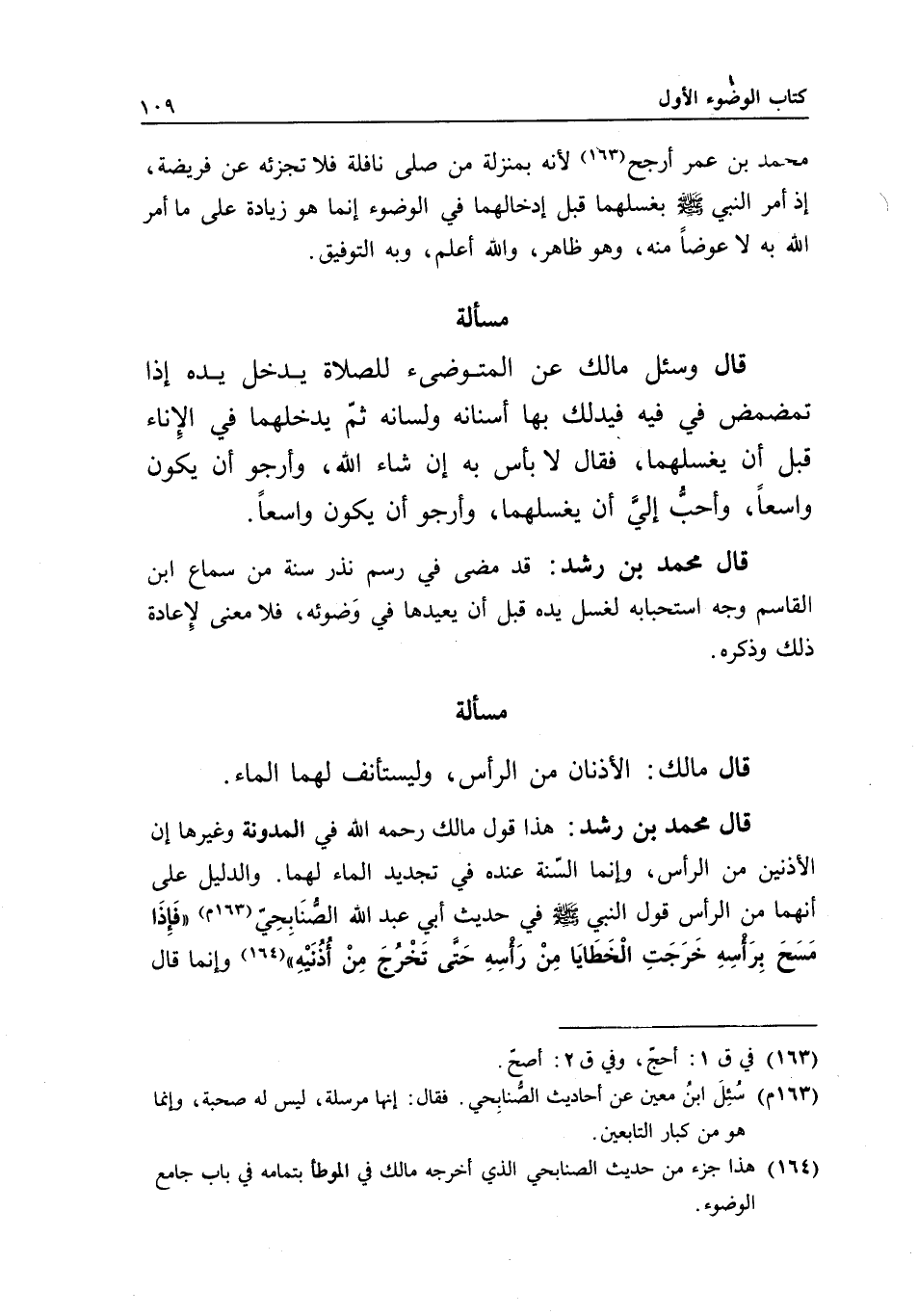 قال محمد بن رشد: هذا قول مالك - رَحِمَهُ اللَّهُ - في المدونة وغيرها: إن الأذنين من الرأس، وإنما السنة عنده في تجديد الماء لهما. والدليل على أنهما من الرأس قول النبي - صَلَّى اللَّهُ عَلَيْهِ وَسَلَّمَ - في حديث أبي عبد الله الصنابحي: «فإذا مسح برأسه خرجت الخطايا من رأسه حتى تخرج من أذنيه» وإنما قال