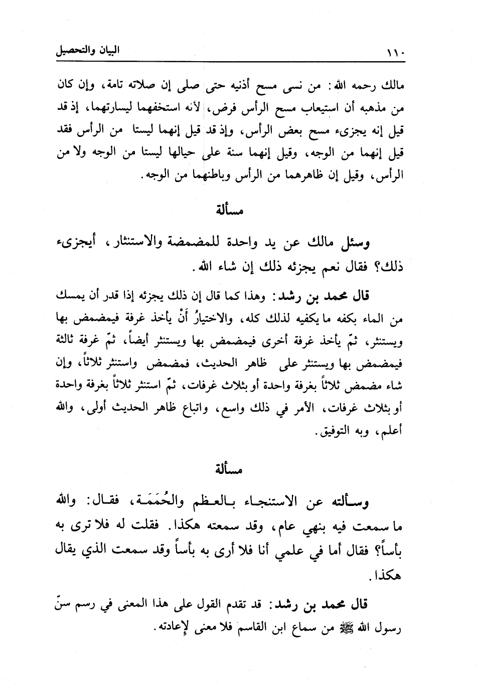 مسألة وسألته عن الاستنجاء بالعظم والحممة، فقال: والله ما سمعت فيه بنهي عام، وقد سمعته هكذا. فقلت له: فلا ترى به بأسا؟ فقال: أما في علمي أنا فلا أرى به بأسا، وقد سمعت الذي يقال هكذا.