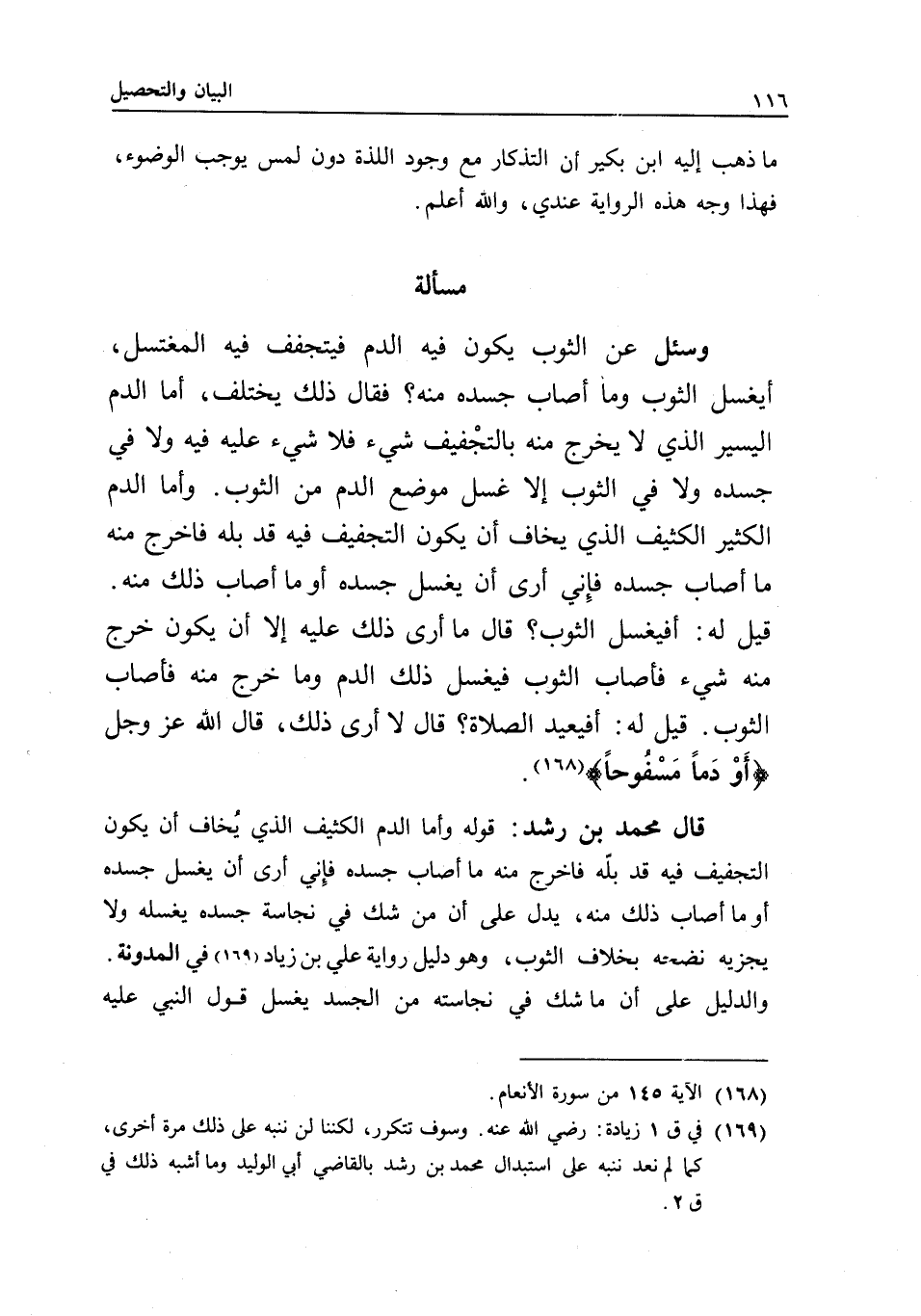 مسألة وسئل عن الثوب يكون فيه الدم فيتجفف فيه المغتسل، أيغسل الثوب وما أصاب جسده منه؟ فقال: ذلك يختلف، أما الدم اليسير الذي لا يخرج منه بالتجفيف شيء فلا شيء عليه فيه ولا في جسده ولا في الثوب إلا غسل موضع الدم من الثوب. وأما الدم الكثير الكثيف الذي يخاف أن يكون التجفيف فيه قد بله فأخرج منه ما أصاب جسده فإني أرى أن يغسل جسده أو ما أصاب ذلك منه. قيل له: أفيغسل الثوب؟ قال: ما أرى ذلك عليه إلا أن يكون خرج منه شيء فأصاب الثوب فيغسل ذلك الدم وما خرج منه فأصاب الثوب. قيل له: أفيعيد الصلاة؟ قال: لا أرى ذلك، قال الله عز وجل: {أَوْ دَمًا مَسْفُوحًا} [الأنعام: 145] .